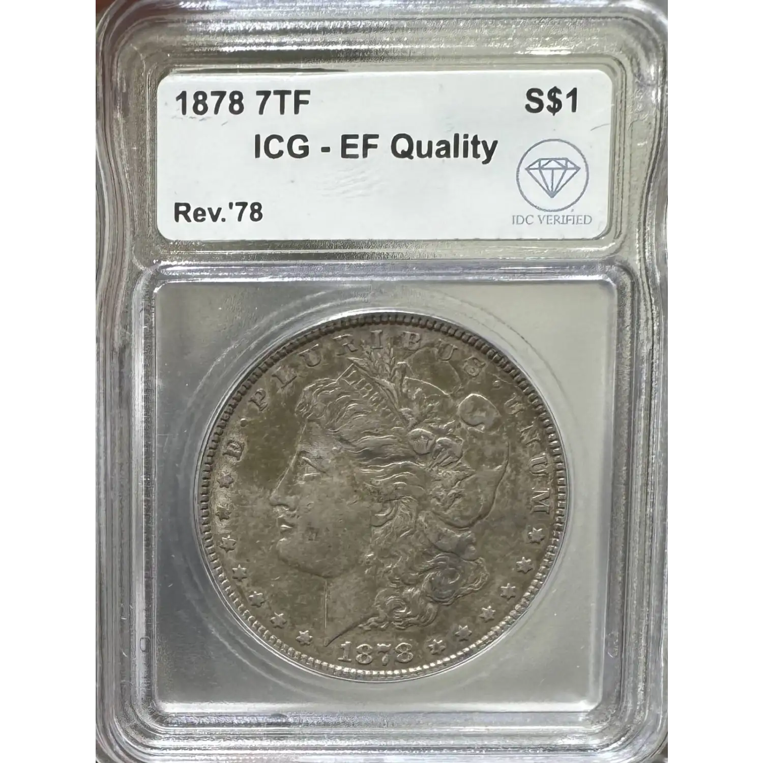 Following the removal of the supernumerary eighth tail feather on the reverse's bald eagle, a bird that normally has only seven tail feathers, the 1878 7TF followed. This coin exists in a few varieties, including the Second Reverse with flat breast on eagle and long arrow shaft, Second Reverse with flat breast on eagle and short arrow shaft, the Third Reverse (Reverse of 1879) with round breast on eagle and slanting top arrow feather, Third Reverse with doubled obverse and no lines in wheat, and Third Reverse (Reverse of 1879) with round breast on eagle and slanting top arrow feather but lines in the wheat leaves. While scarcer in Gem MS grades than circulated and further difficult with PL or DMPL designations than non-PL, the 1878 7TF Morgan dollar is frequently encountered across the marketplace in most of the actively traded grade levels.
