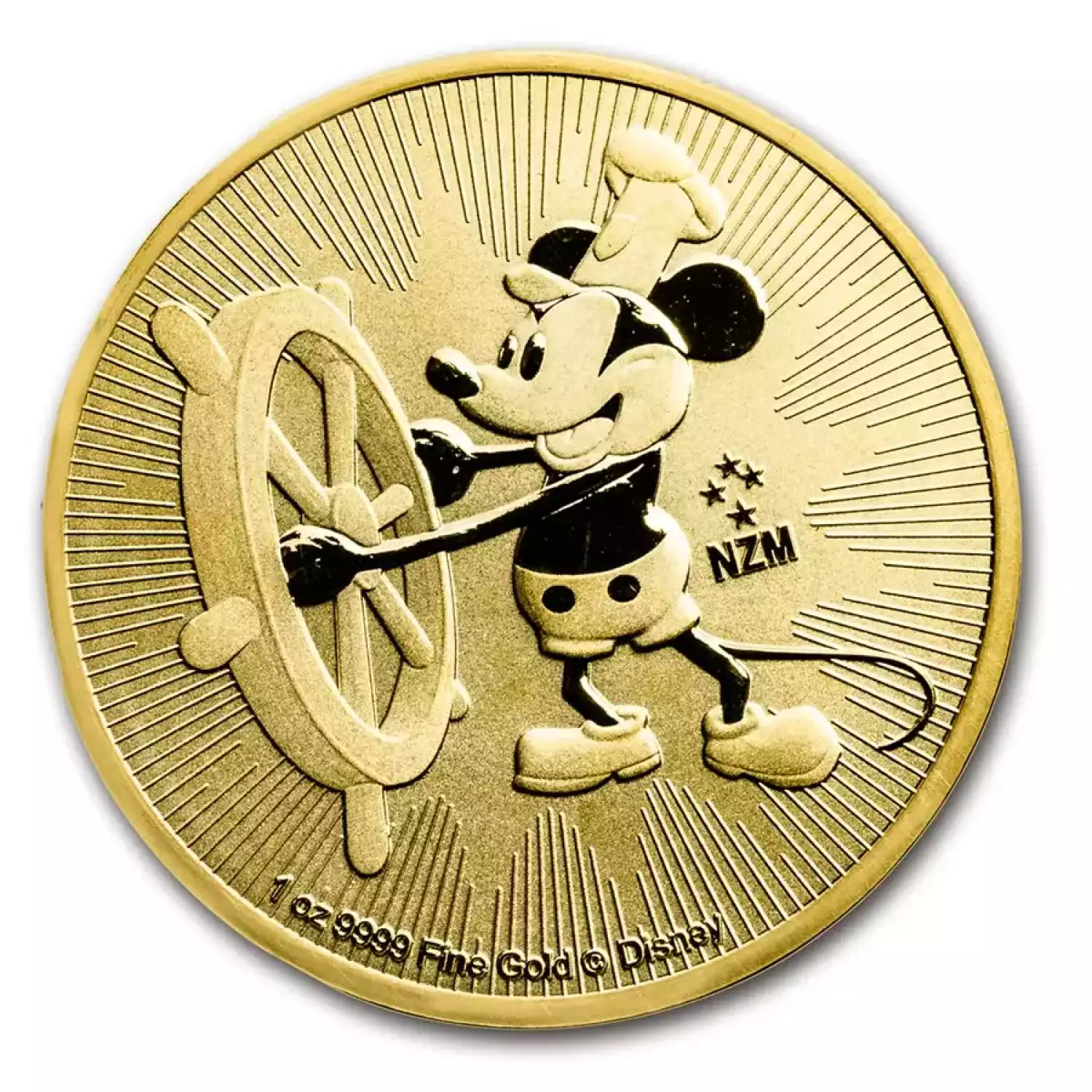This .9999 fine Gold coin features the image of Mickey Mouse from his first film, "Steamboat Willie". This coin has a limited worldwide mintage of 25,000 coins!