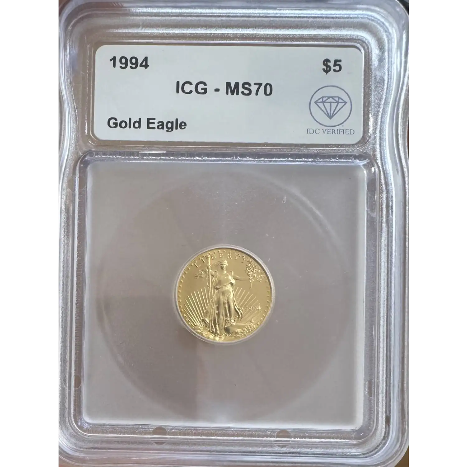 The 1994 5 Dollars is part of a series of Gold Eagle coins struck from 1986-Present. The specific variety is Gold Eagle. Struck in Philadelphia and designated as a Business (MS) strike, this coin is made of 91.67% gold; 3% silver; 5.33% copper from a mintage of 206,380 struck.