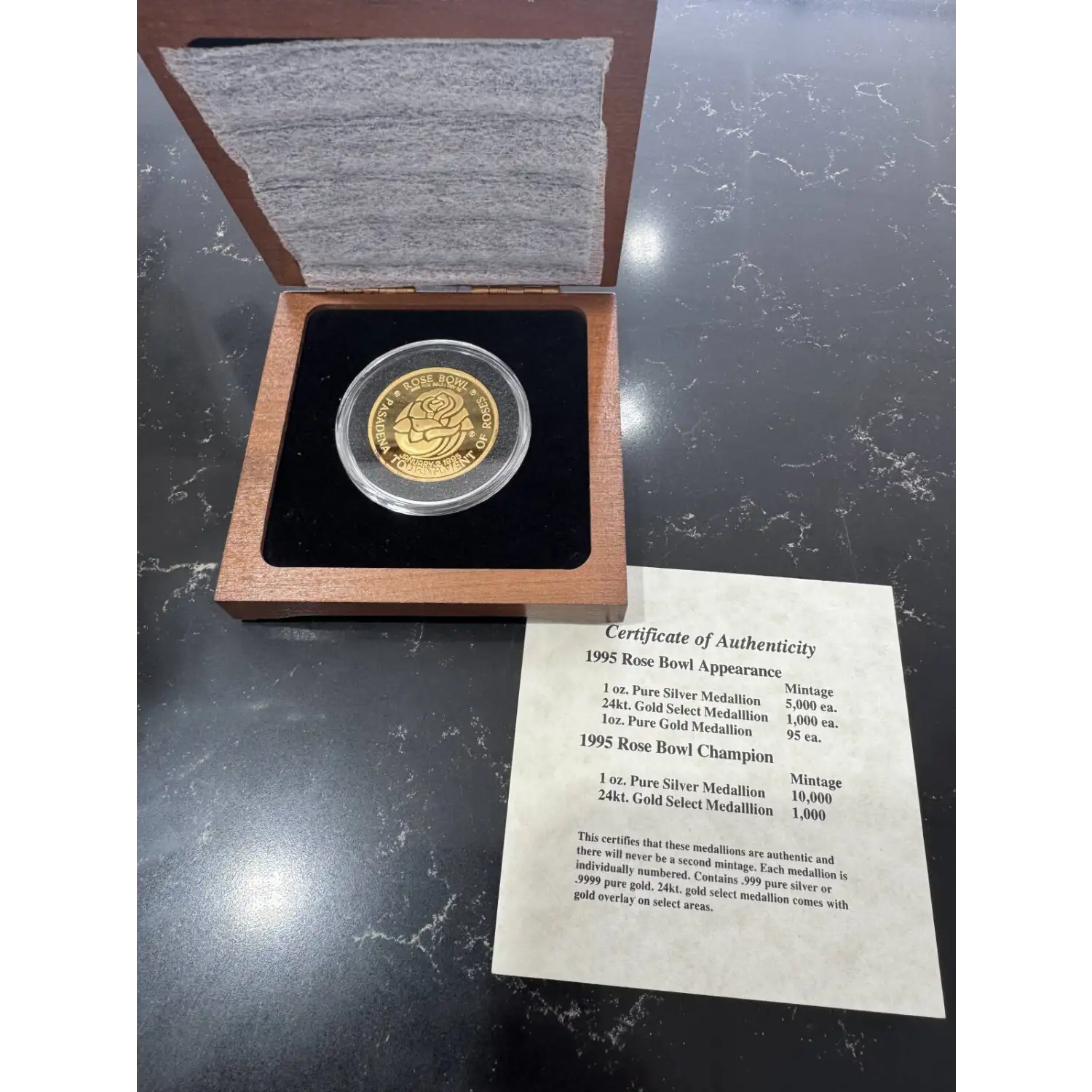 | Name | 1995 Oregon Rose Bowl Tournament 1 oz Gold Medallion (Box and COA) |
