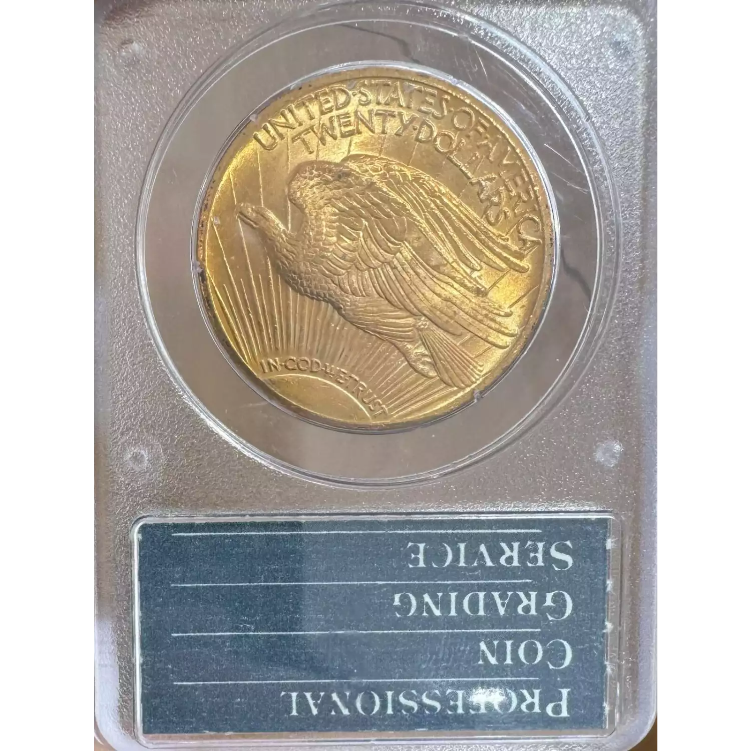 Reverse: A crescent sun appears at the bottom as if rising on the horizon with long rays extending to the top of the coin. A flying eagle covers the central portion, atop the rays. The words UNITED STATES oF AMERICA, TWENTY DOLLARS appear on the top periphery.