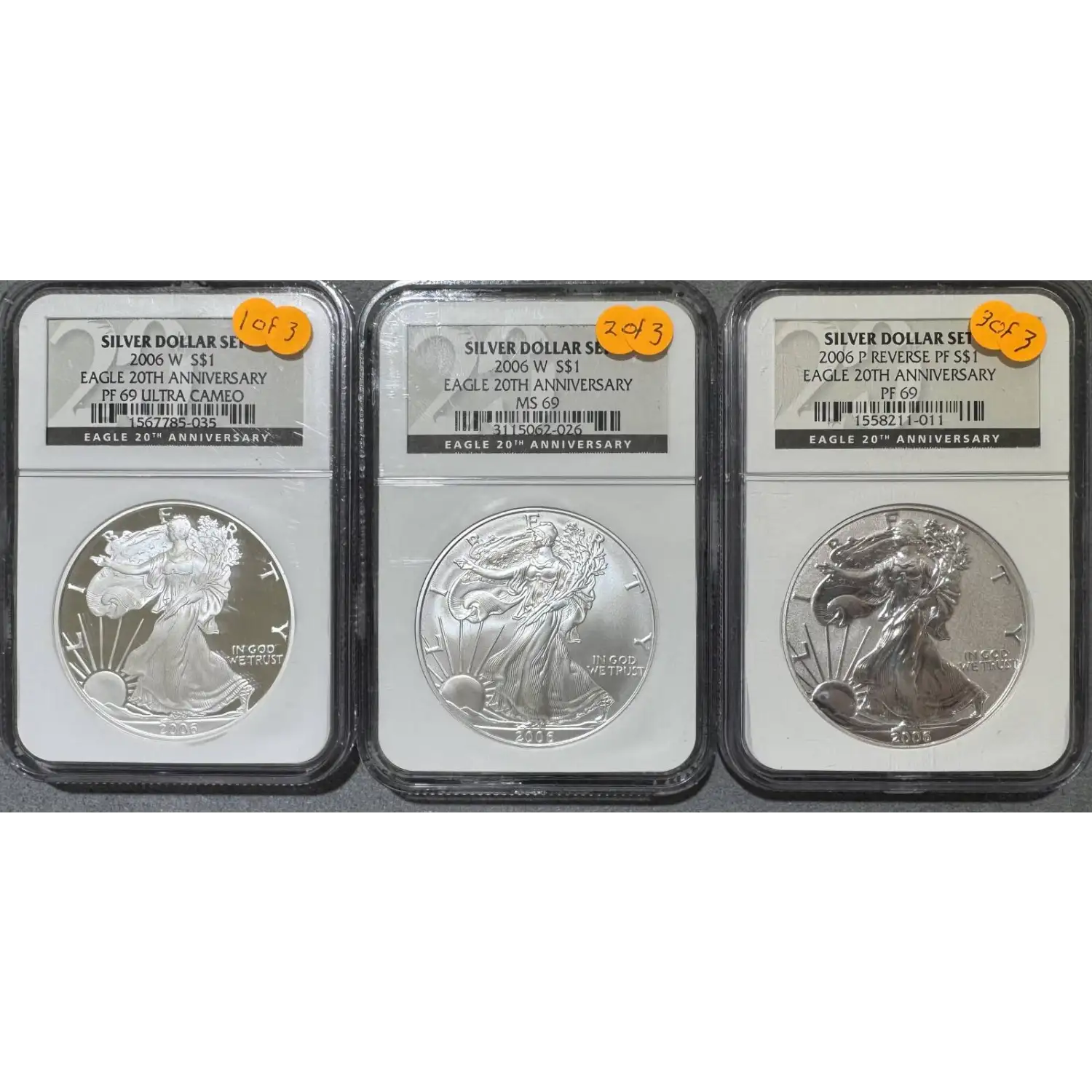 | Name | 2006 American Silver Eagle 20th Anniversary NGC 3 Coin Set (W PF69 UC/W MS69/P Reverse PF69) |