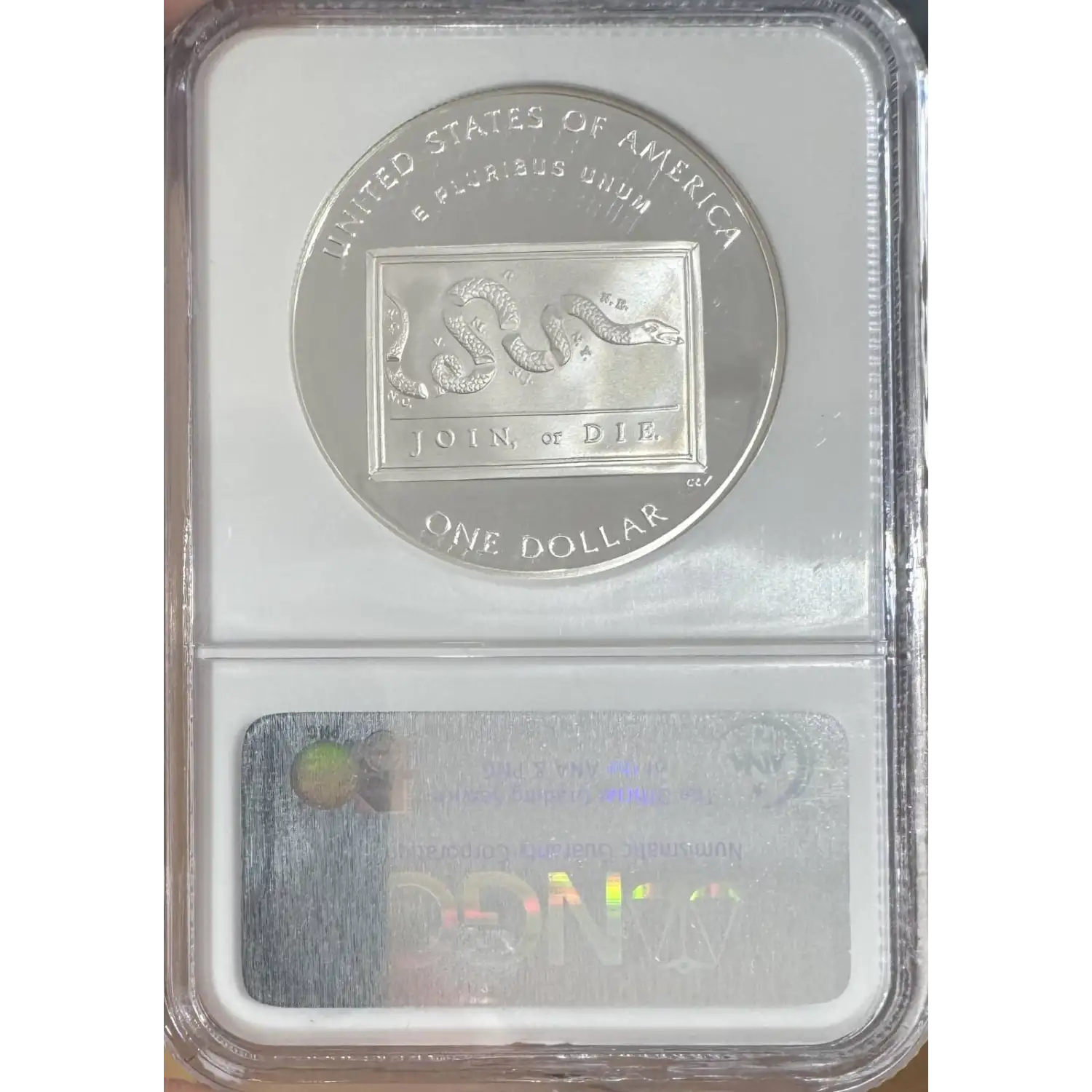The reverse was designed by Charles Vickers, and it depicts one of Franklin’s famous political cartoons of a snake being cut into pieces with the caption “JOIN OR DIE” as this cartoon was supposed to influence the colonies that were resisting opposing British rule of the American colonies.