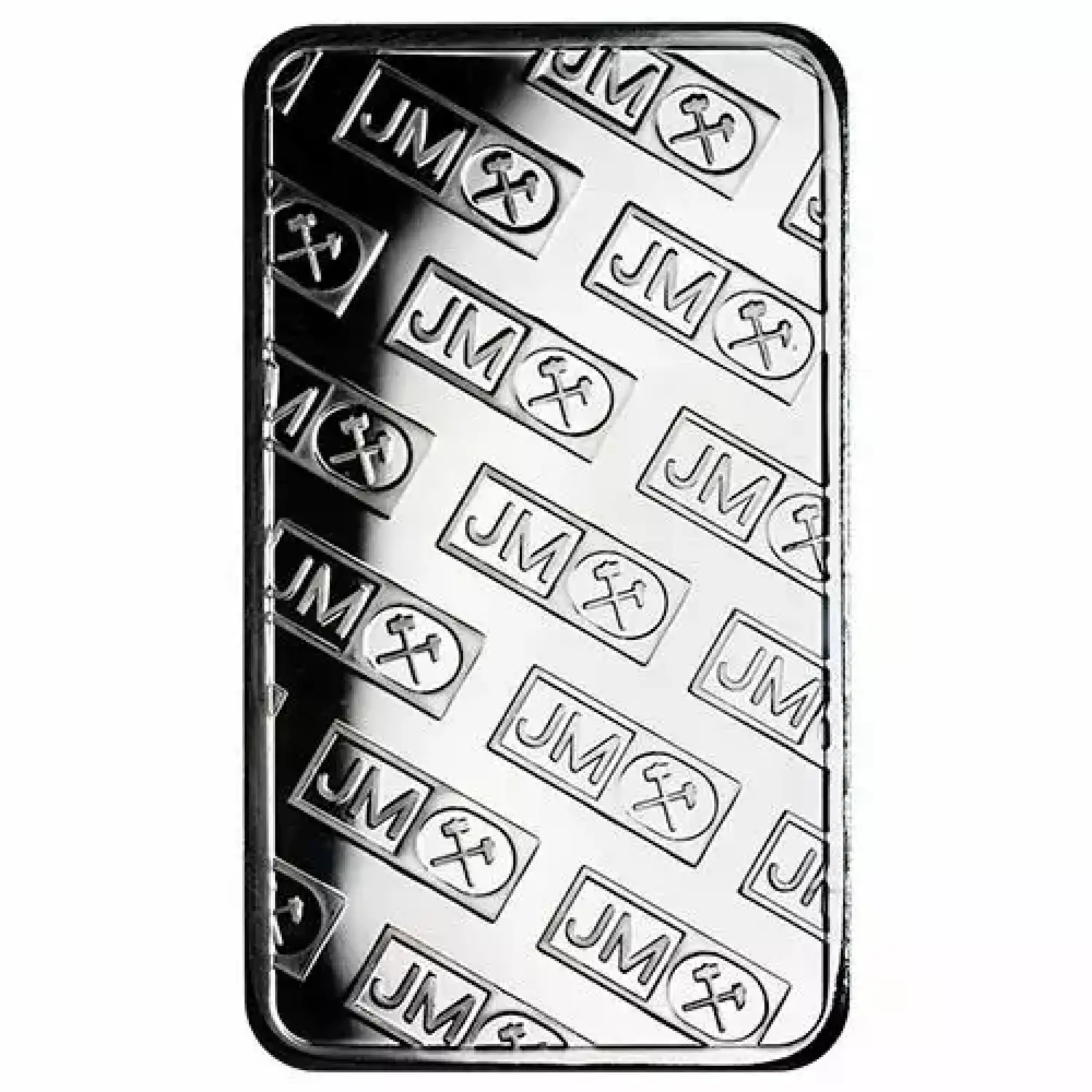 The bar’s essential hallmarks are vertically aligned beneath Johnson Matthey’s logo on the obverse side. They refer to the company’s logo, metal content, fineness, and weight.