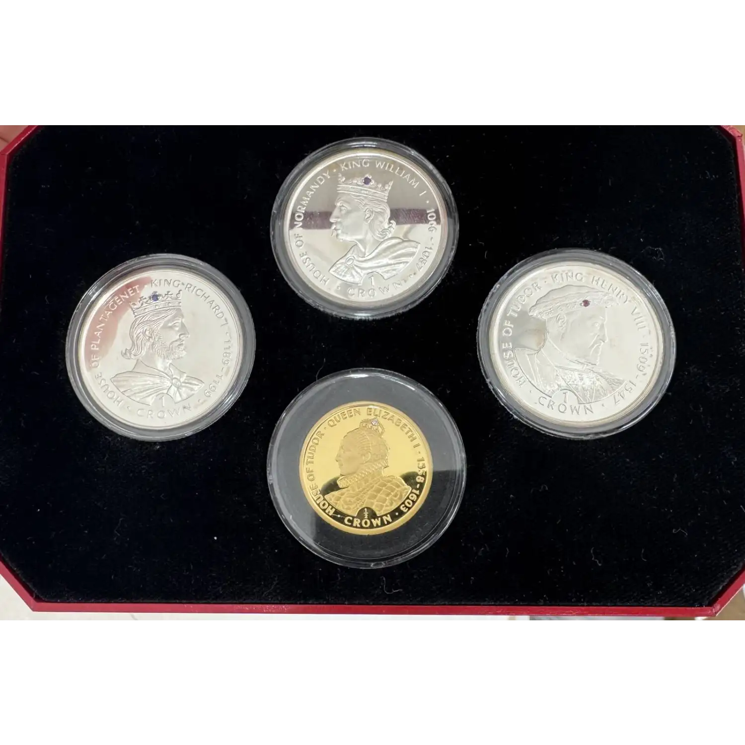 The "Crown Jewels" set was issued by Gibraltar to honor past rulers of England. Each coin has a small jewel embedded in the crown of the Sovereign. They are as follows; William: Amethyst, Richard: Sapphire, Henry: Ruby, Elizabeth: Diamond.