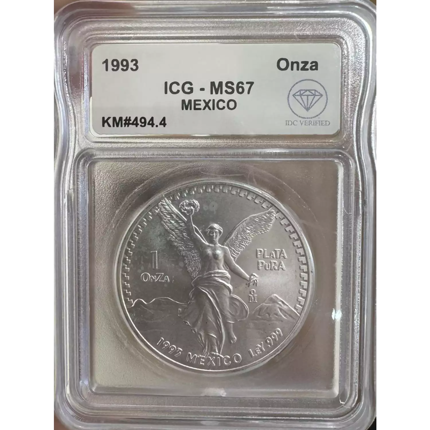 | Name | 1993 Mexican 1 onza Silver Libertad ICG MS67 - IDC Verified |