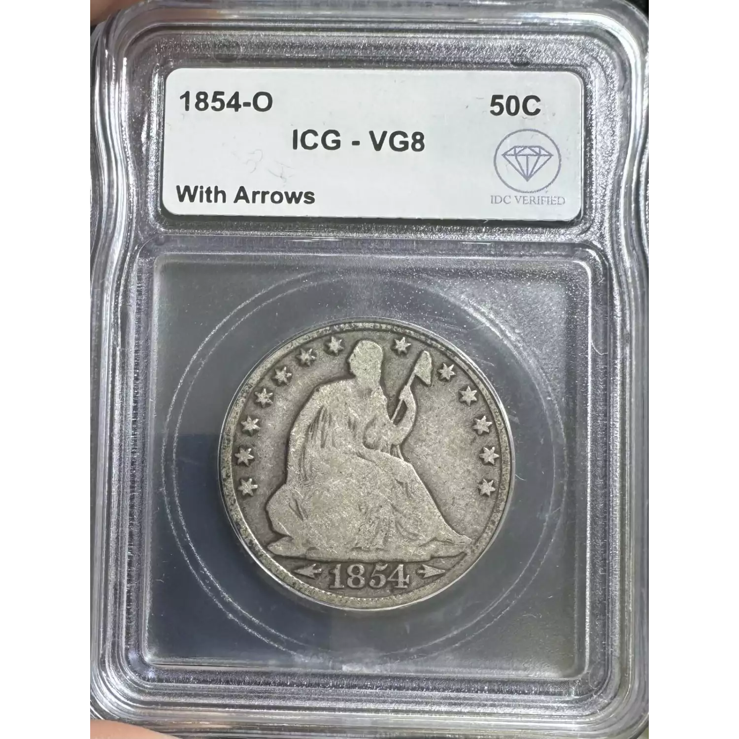The 1854-O 50 Cents is part of a series of Liberty Seated half dollar coins struck from 1854-1855. The specific variety is Arrows. Struck in New Orleans and designated as a Business (MS) strike, this coin is made of 90% silver; 10% copper from a mintage of 5,240,000 struck.