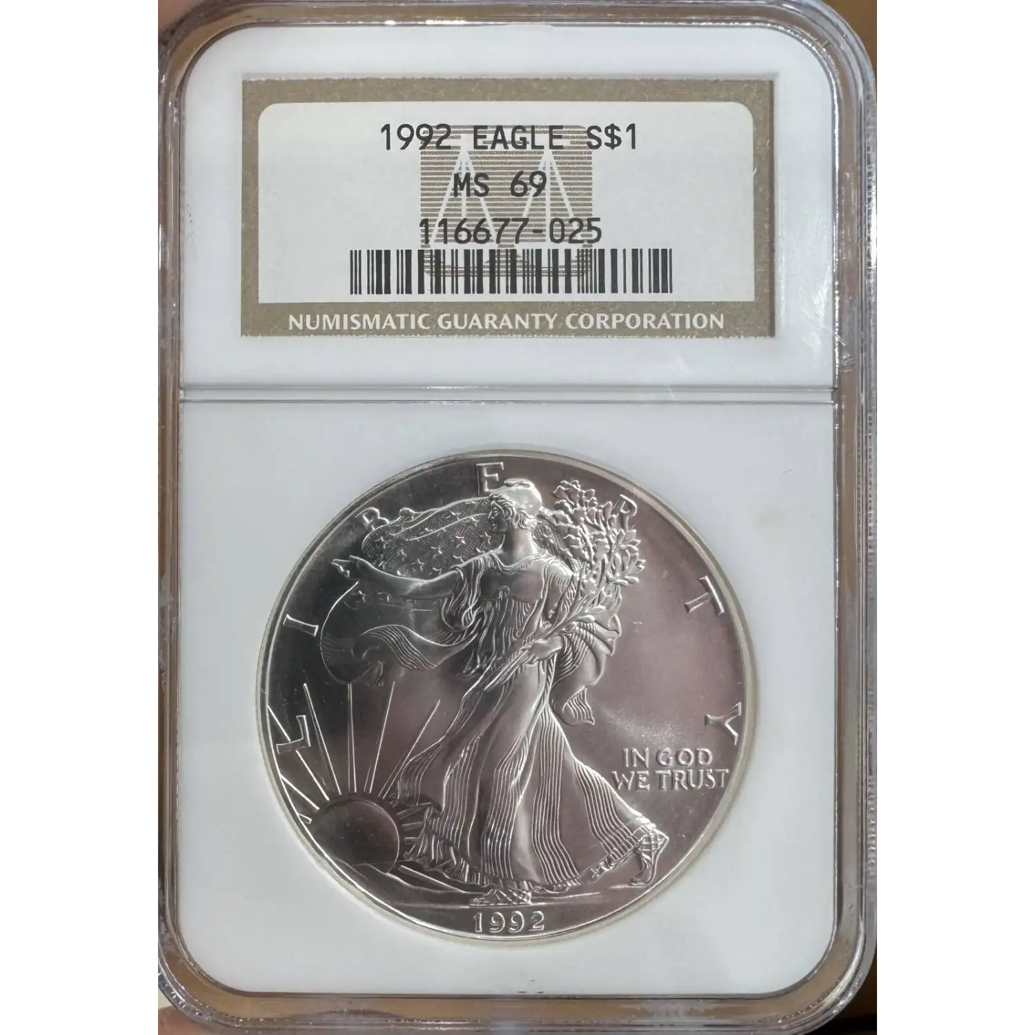 The 1992 One dollar is part of a series of Silver eagle coins struck from 1986-Present. The specific variety is Silver Eagle. Struck in Philadelphia and designated as a Business (MS) strike, this coin is made of 99.93% silver, 0.007% copper from a mintage of 5,540,068 struck.