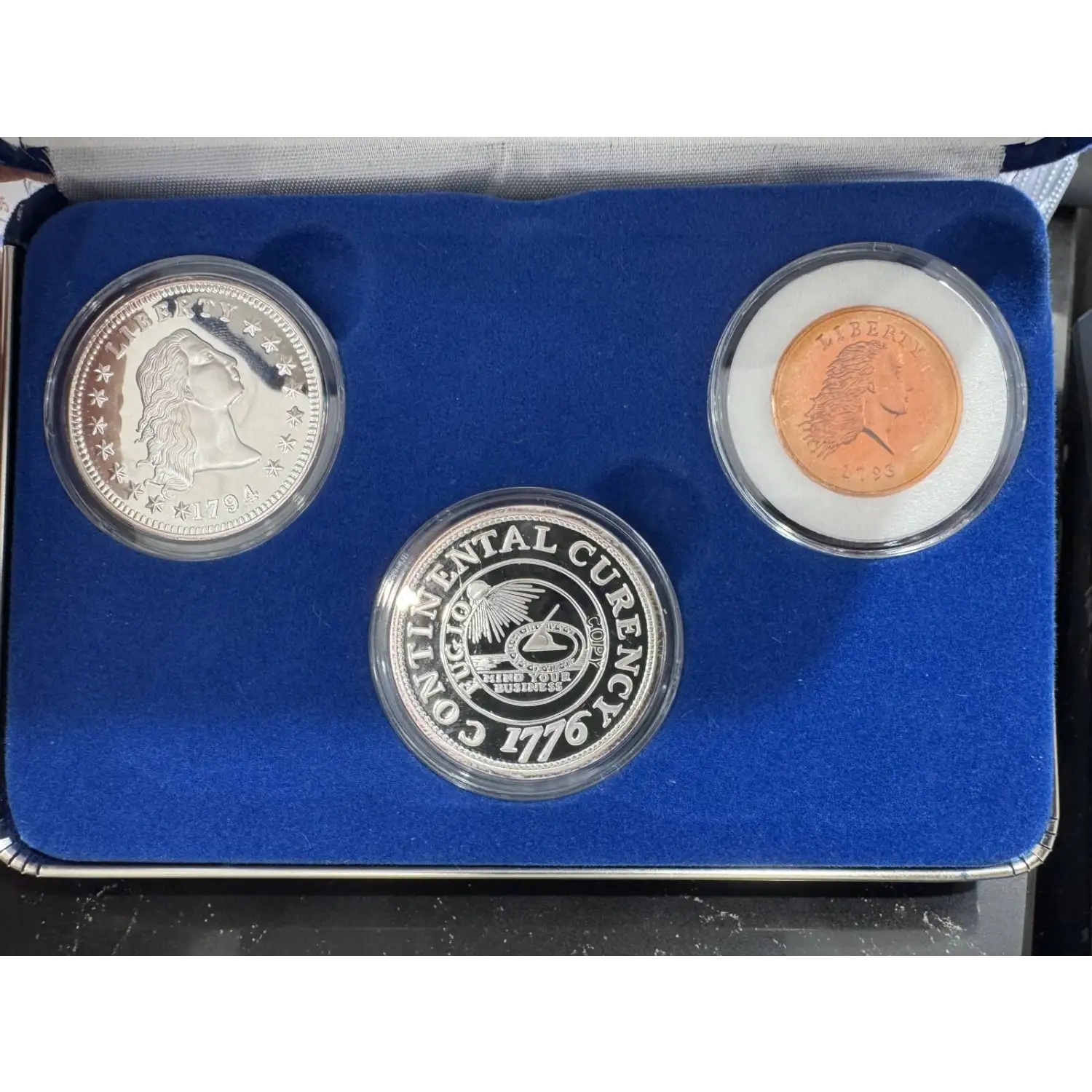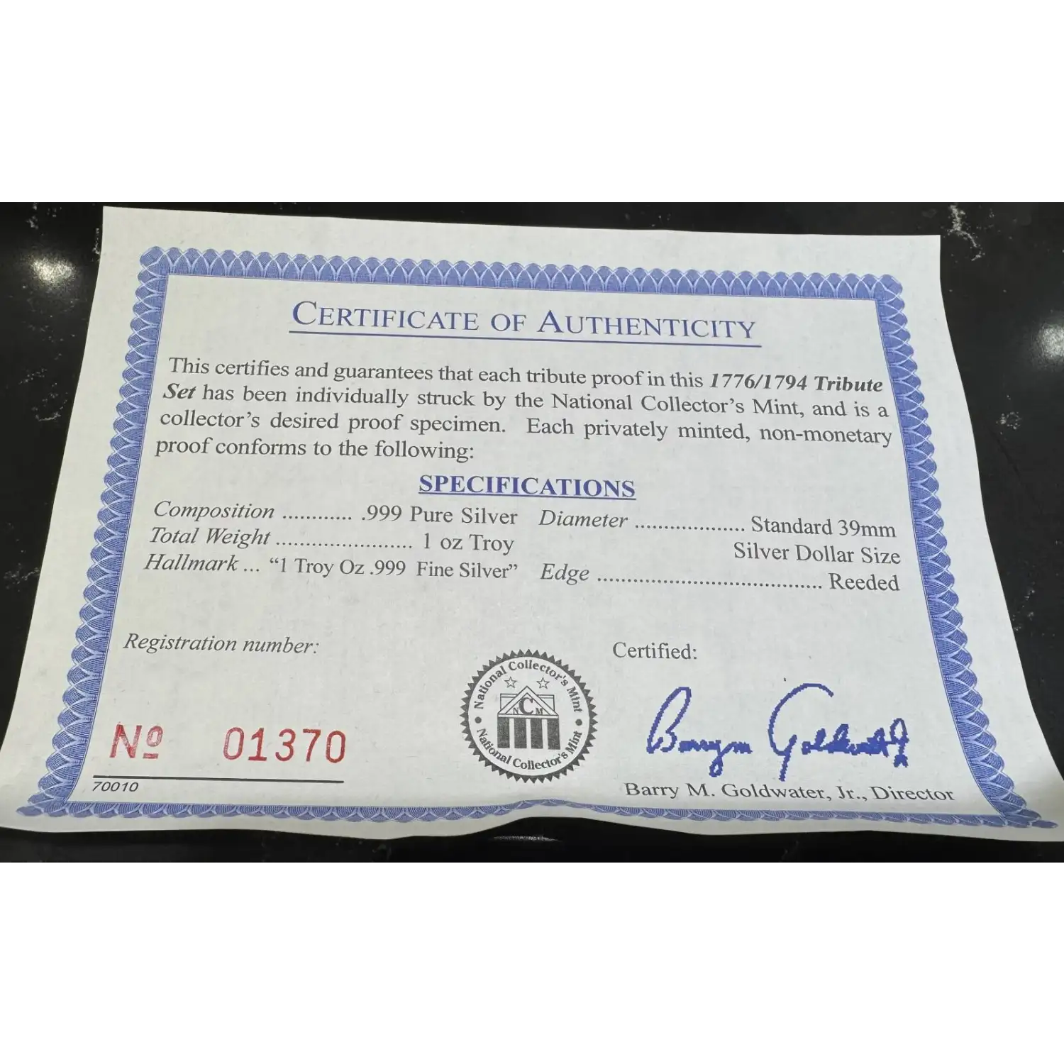 This is a 1776 / 1794 Tribute Proof Set from the National Collector's Mint Which Contains 2 oz's of Pure SilverPROOF ConditionBEWARE: Many of these sets and coins look the same but have NO SILVER in them, read decriptions carefully!!! This set has (2) coins each with 1 troy ounce of pure .999 Silver!.999 Pure SILVERCommemorative 1776 / 1794 Fitted Box Set3 PROOF CoinsIndividually Struck andNumbered 3 Proof Coin SetNational Collectors MintLimited EditionThis coin set was issued by the National Collectors Mint in America. The set comes in it's original fitted box with Certificate of Authenticity. A Limited number of Sets have been issued.The set contains 3 coins. All coins are individually struck PROOF coins and individually numbered.Two of the coins are PROOF .999 Pure Silver and weigh 1oz Troy each. The Third coin is a 1793 pure copper chain cent tribute.The coins come in a fitted box issued by the National Collectors Mint. The box is Blue in color.