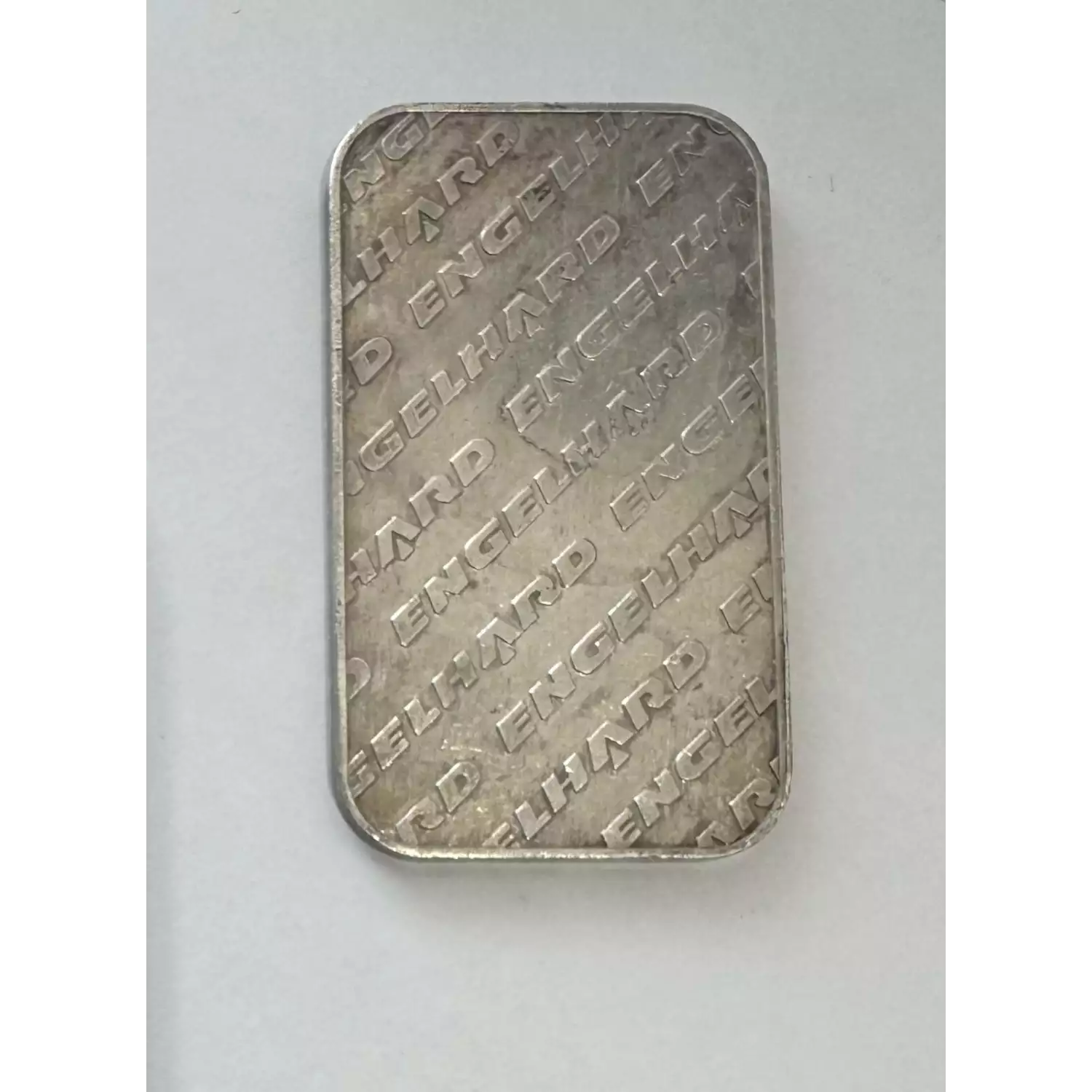 This is the last style that Engelhard made in a 1 oz bar. This pressed bar features an eagle flying over an American flag and is marked with a unique serial number.