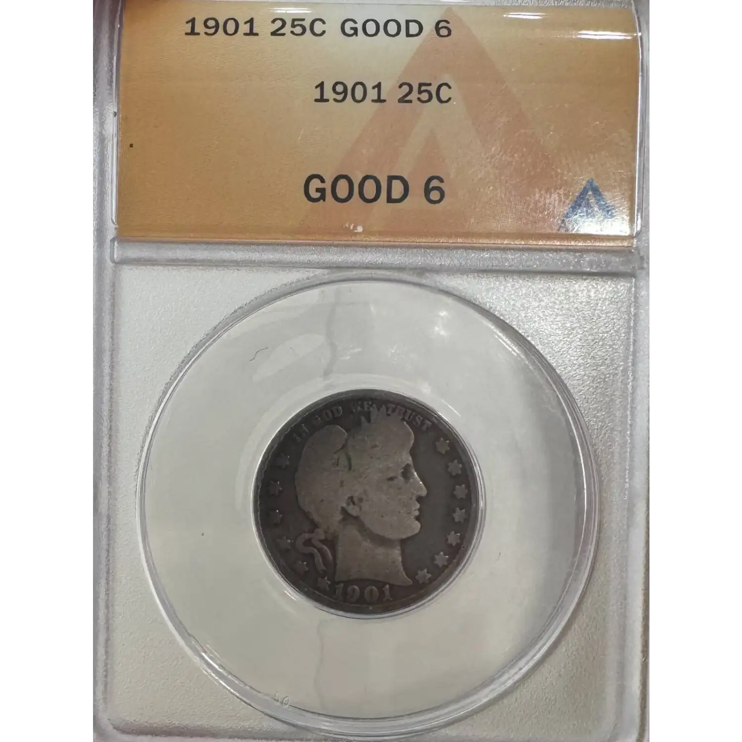 The 1901 25 Cents is part of a series of Liberty head (Barber) quarter coins struck from 1892-1916. Struck in Philadelphia and designated as a Business (MS) strike, this coin is made of 90% silver; 10% copper from a mintage of 8,892,000 struck.