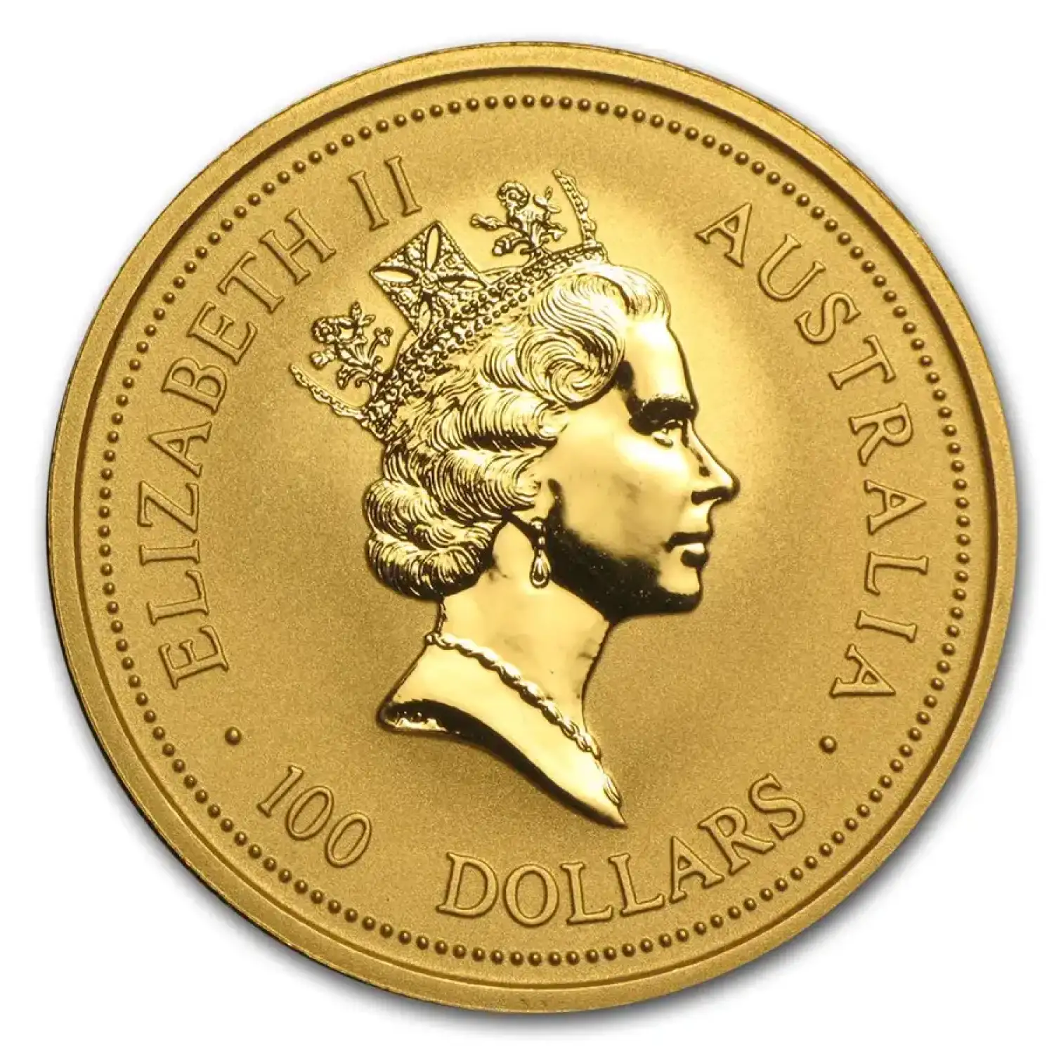 The 1996 1 oz Gold Nugget features a Kangaroo with a joey, design by Louise Pinder.