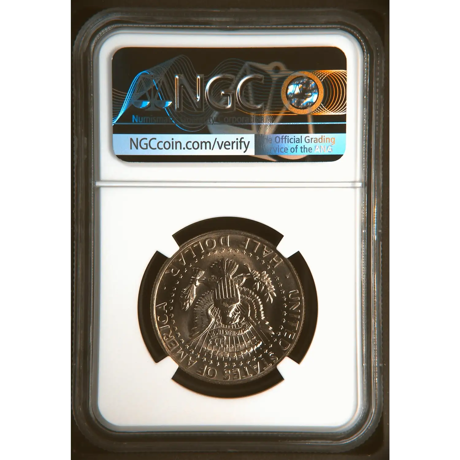 Reverse: The heraldic eagle holding arrows and branch of olive leaves with a full circle of stars around it. UNITED STATES OF AMERICA * HALF DOLLAR surround the periphery.