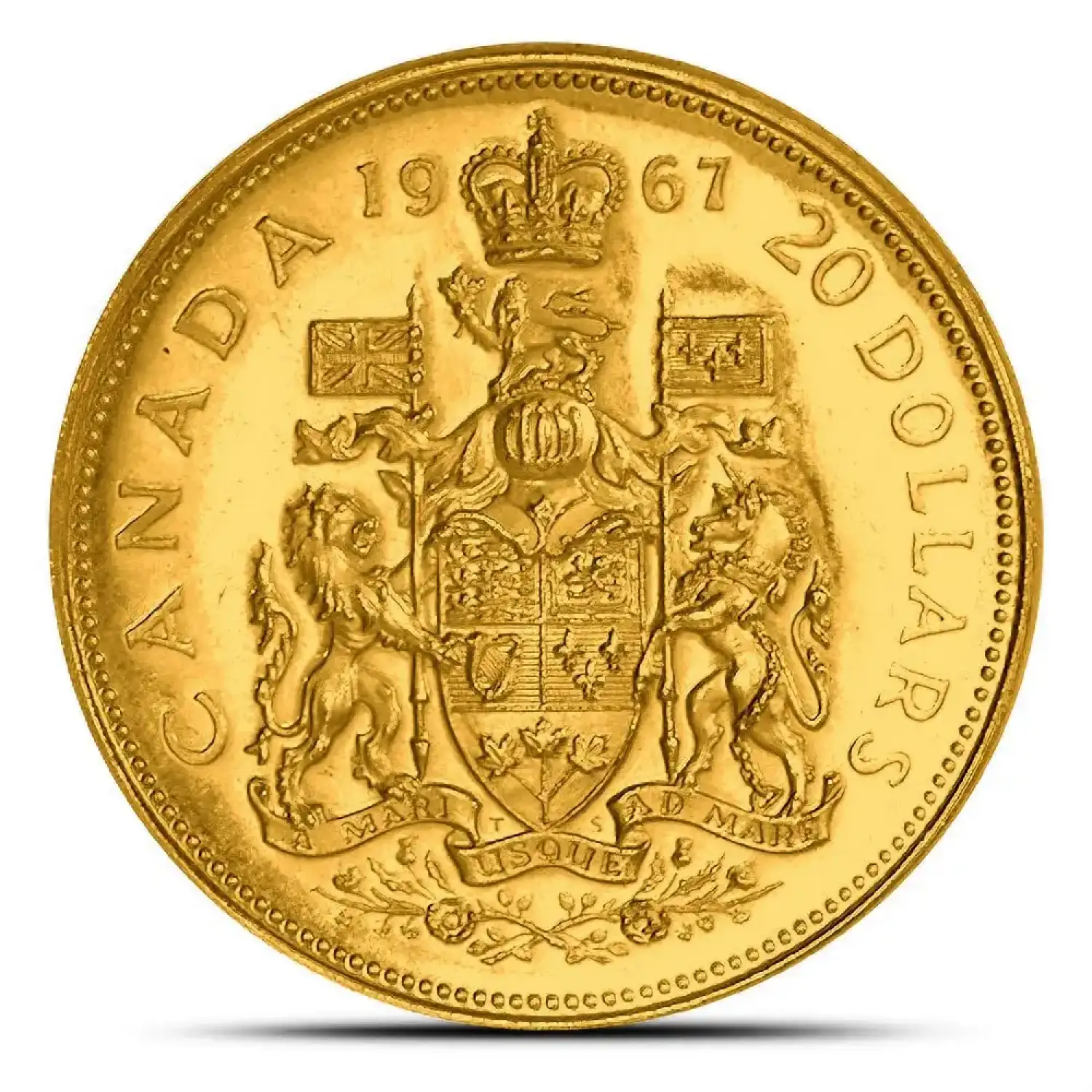 In 1867, the British colonial territories of Canada started a movement toward independence known as confederation. To mark the 100th anniversary of this movement in 1967, the Royal Canadian Mint issued commemorative coins with a bust of Queen Elizabeth II and the coat of arms of Canada.