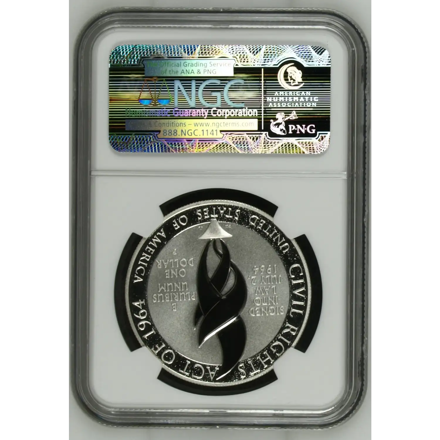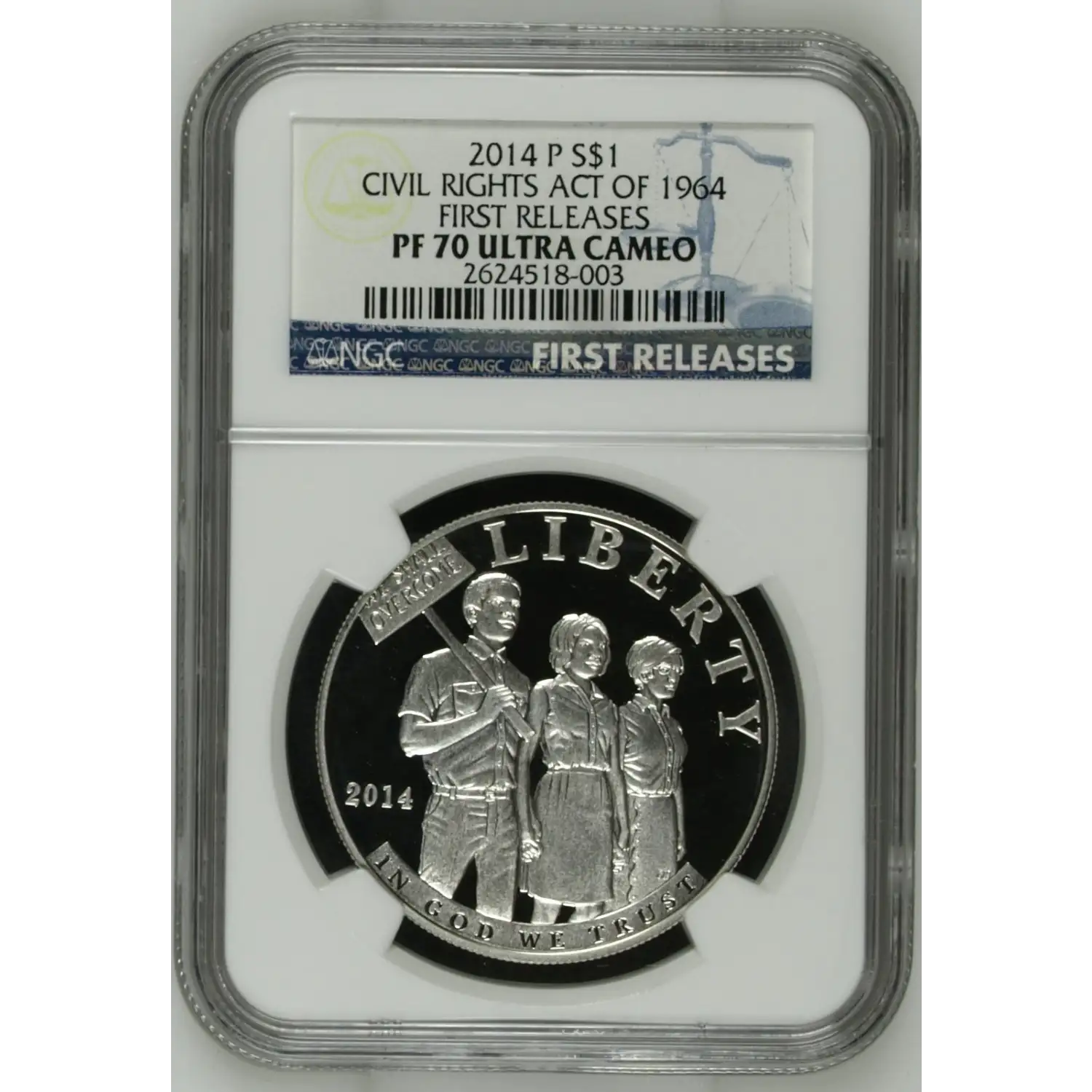 The 2014-P Silver dollar is part of a series of Modern Commemorative coins struck from 2014. The specific variety is Civil Rights Act of 1964. Struck in Philadelphia and designated as a Proof (PR) strike, this coin is made of 90% silver, 10% copper from a mintage of 61,992 struck.