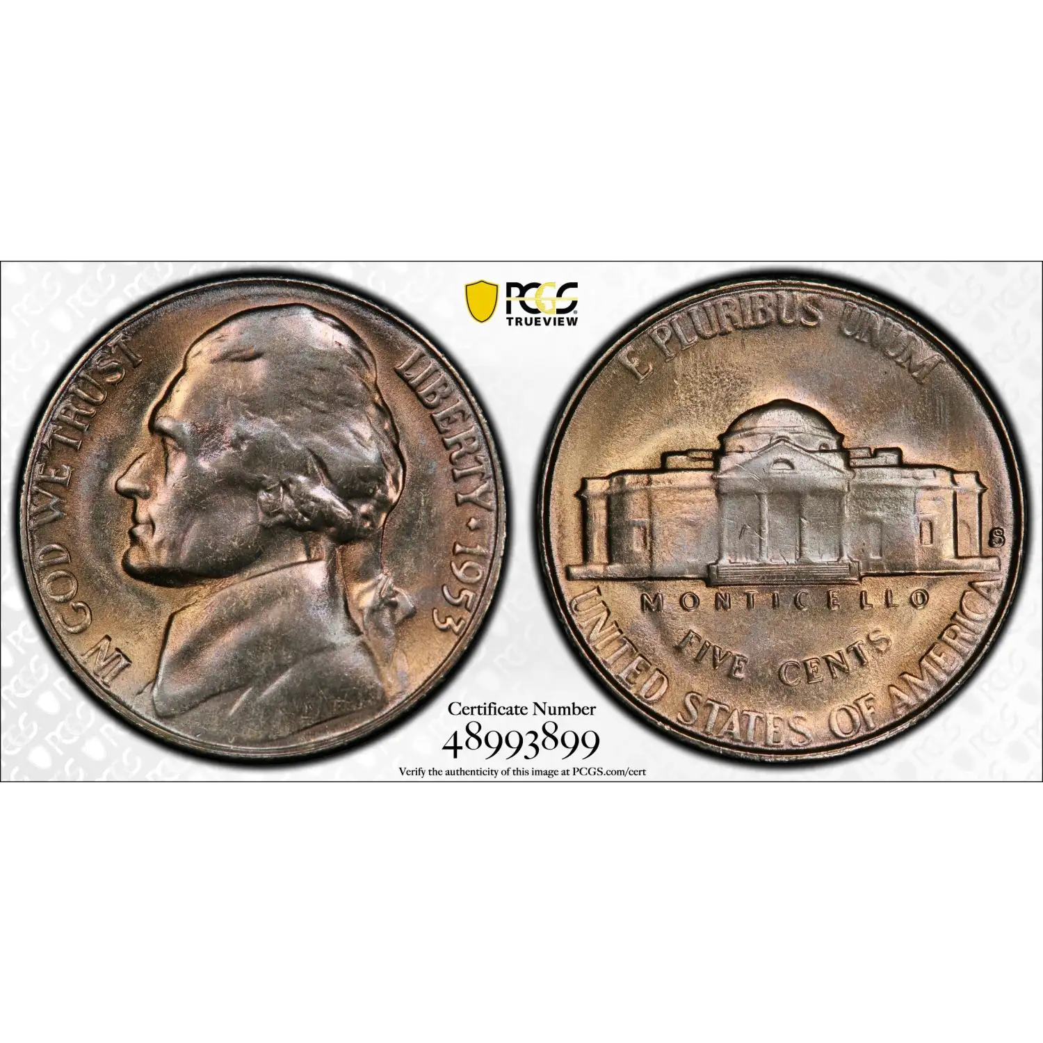 Reverse: The Jefferson home is prominently centered with the name MONTICELLO captioned below. The denomination FIVE CENTS is spelled out in half circle underneath and the words E PLURIBUS UNUM and UNITED STATES OF AMERICA appear at the top and bottom periphery. The mintmark is positioned on the right side of Monticello.