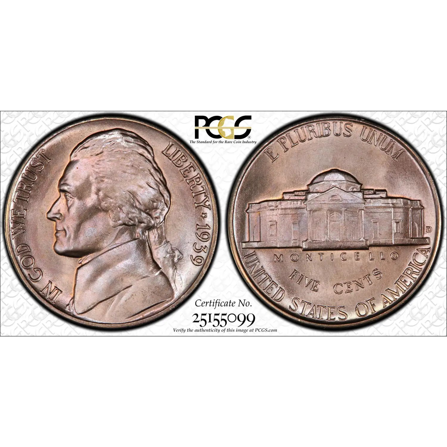 The 1939-D is the key issue in the Jefferson nickel series, regarding basic availability in Mint State (not considering numerical gradations of Mint State and not considering the step count). It has been a favorite for a long time. Likely, about 25% of the mintage is from the Reverse of 1938, and the remainder or larger portion is from the Reverse of 1940. Few numismatists have sought one of each, so there is no market differential, except for sharp steps. Mint luster and eye appeal are usually very good. The FS denotes that the striking detail on the steps of the Jefferson memorial building are clearly defined. (Q.David Bowers)