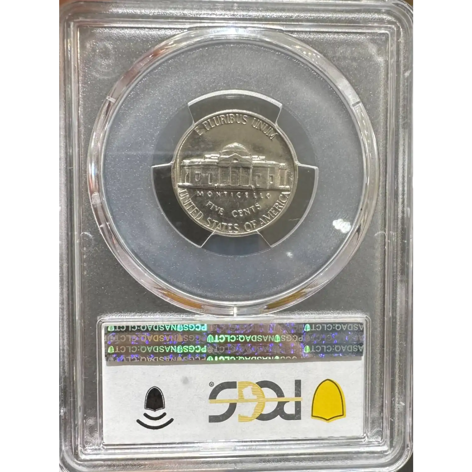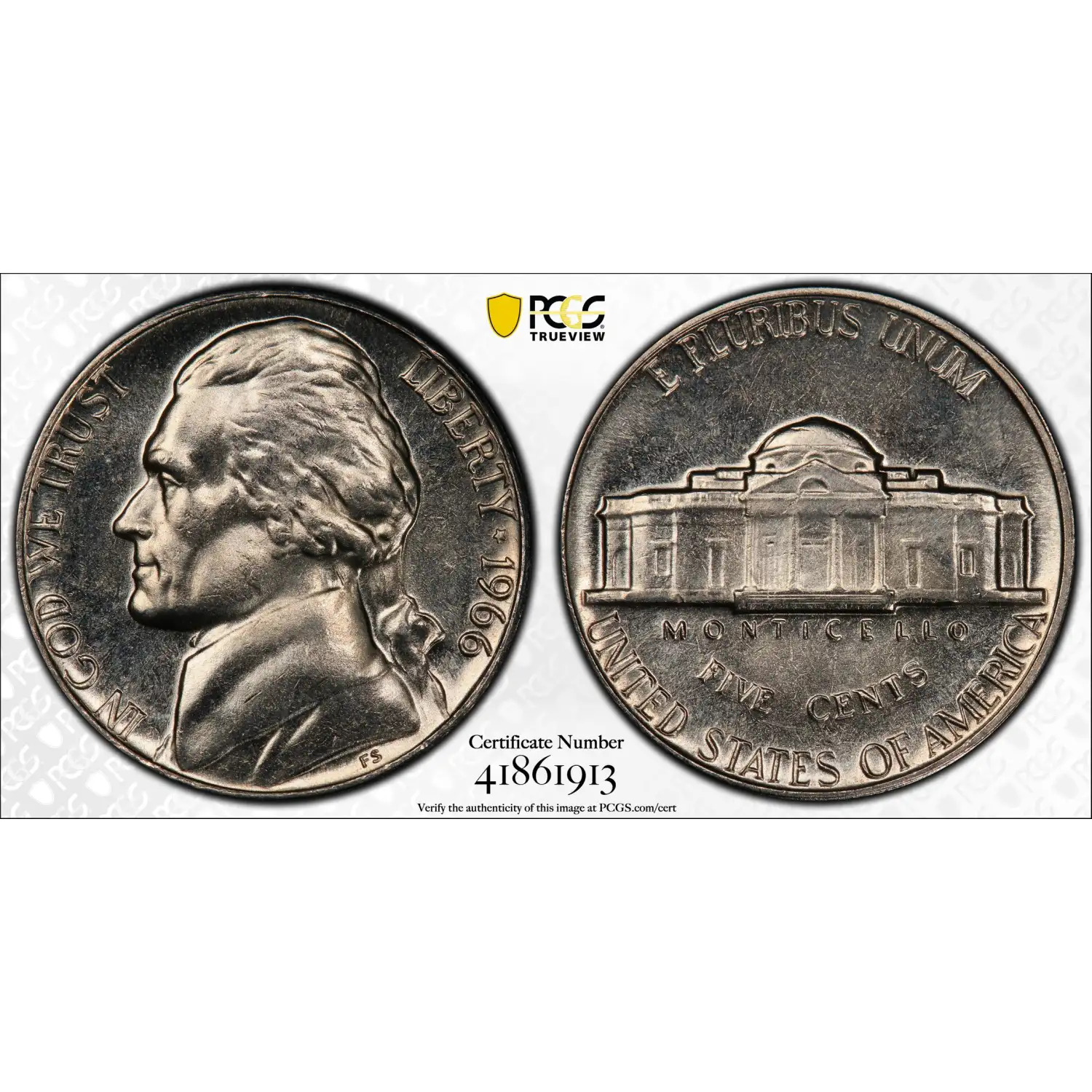 Reverse: The Jefferson home is prominently centered with the name MONTICELLO captioned below. The denomination FIVE CENTS is spelled out in half circle underneath and the words E PLURIBUS UNUM and UNITED STATES OF AMERICA appear at the top and bottom periphery.