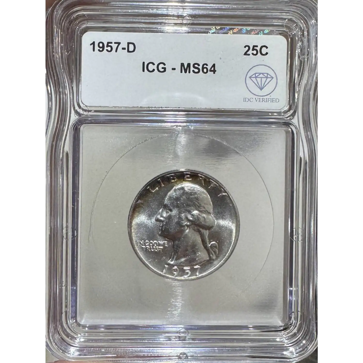 The 1957-D 25 Cents is part of a series of Washington quarter coins struck from 1932-1964. Struck in Denver and designated as a Business (MS) strike, this coin is made of 90% silver; 10% copper from a mintage of 77,924,160 struck.