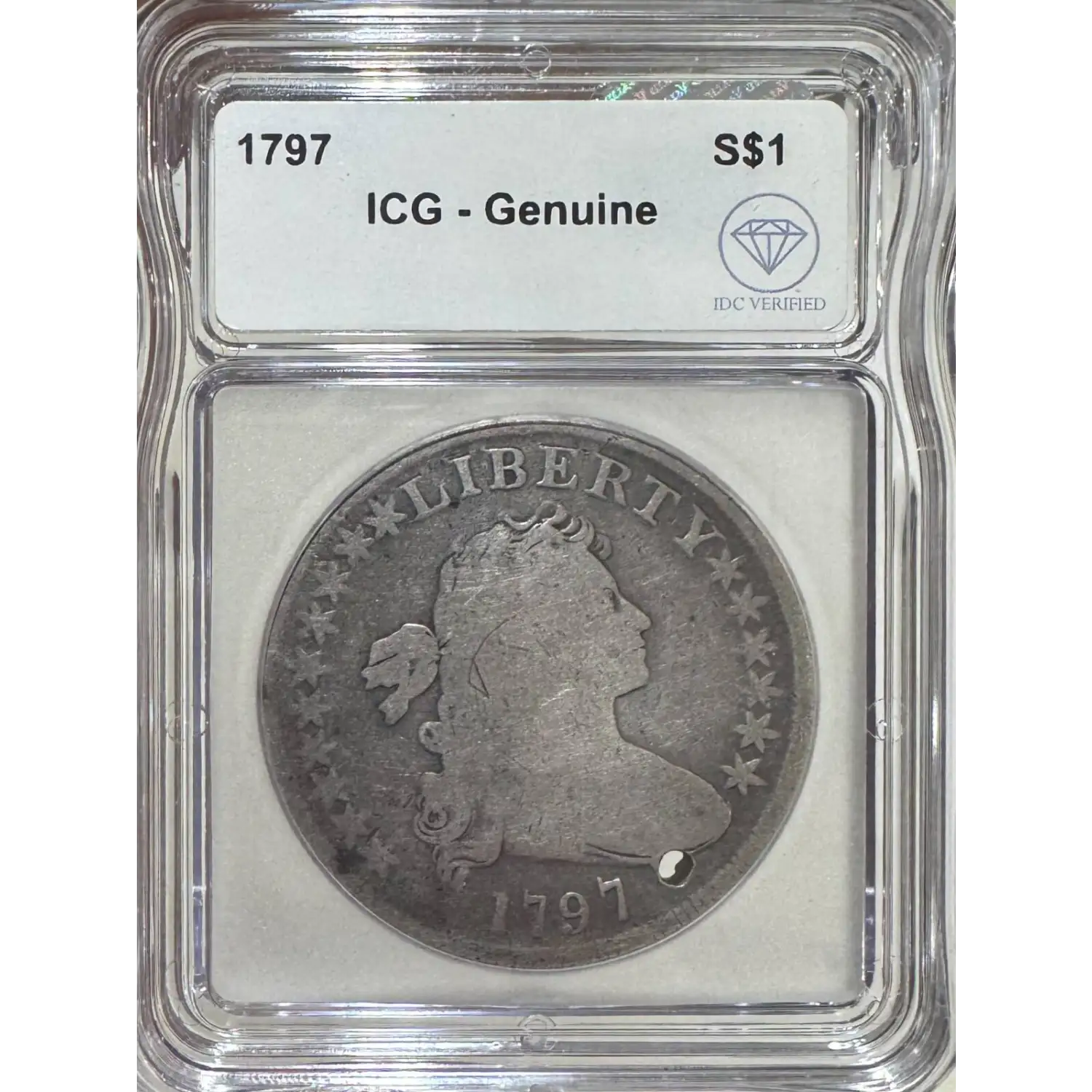 The 1797 One Dollar is part of a series of Draped bust silver dollar coins struck from 1795-1798. The specific variety is 10x6 Stars, Large Letters. Struck in Philadelphia and designated as a Business (MS) strike, this coin is made of 89% silver; 11% copper from a mintage of 7,776 struck and has a rarity rating of 2.