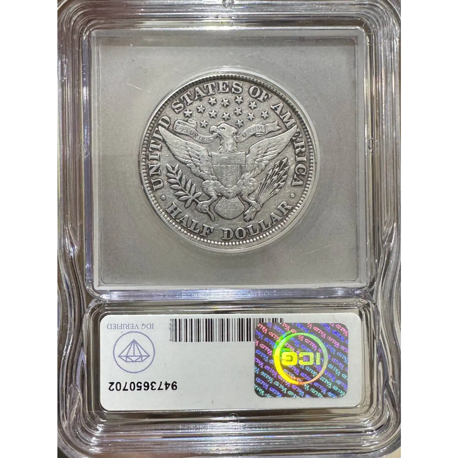 Reverse: The heraldic eagle holding the symbolic olive branches and arrows is centered in the design with the words UNITED STATES OF AMERICA and HALF DOLLAR around the periphery. A ribbon in the eagle's beak bears the motto E PLURIBUS UNUM. 13 stars appear in the field above the eagle's head. Mintmark, if any, is positioned under the eagles tail feathers, above the D in DOLLAR.