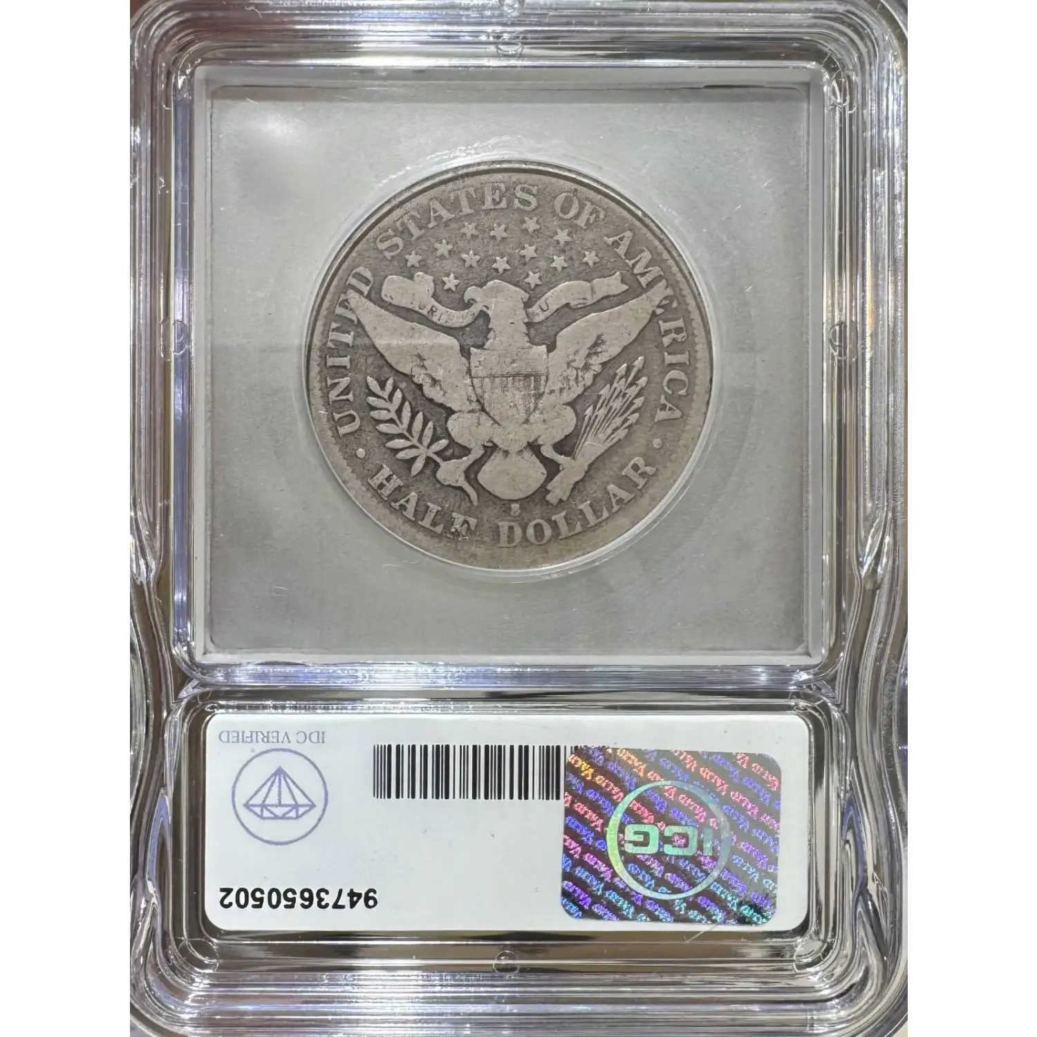 Reverse: The heraldic eagle holding the symbolic olive branches and arrows is centered in the design with the words UNITED STATES OF AMERICA and HALF DOLLAR around the periphery. A ribbon in the eagle's beak bears the motto E PLURIBUS UNUM. 13 stars appear in the field above the eagle's head. Mintmark, if any, is positioned under the eagles tail feathers, above the D in DOLLAR.