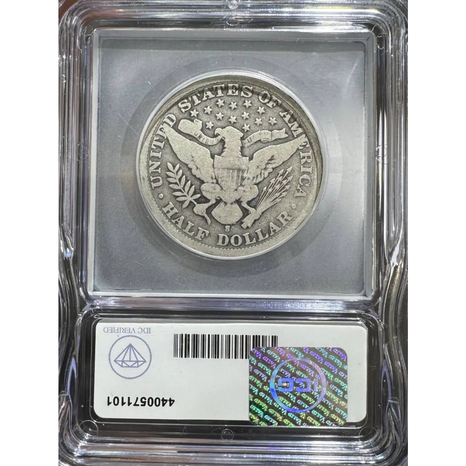 Reverse: The heraldic eagle holding the symbolic olive branches and arrows is centered in the design with the words UNITED STATES OF AMERICA and HALF DOLLAR around the periphery. A ribbon in the eagle's beak bears the motto E PLURIBUS UNUM. 13 stars appear in the field above the eagle's head. Mintmark, if any, is positioned under the eagles tail feathers, above the D in DOLLAR.