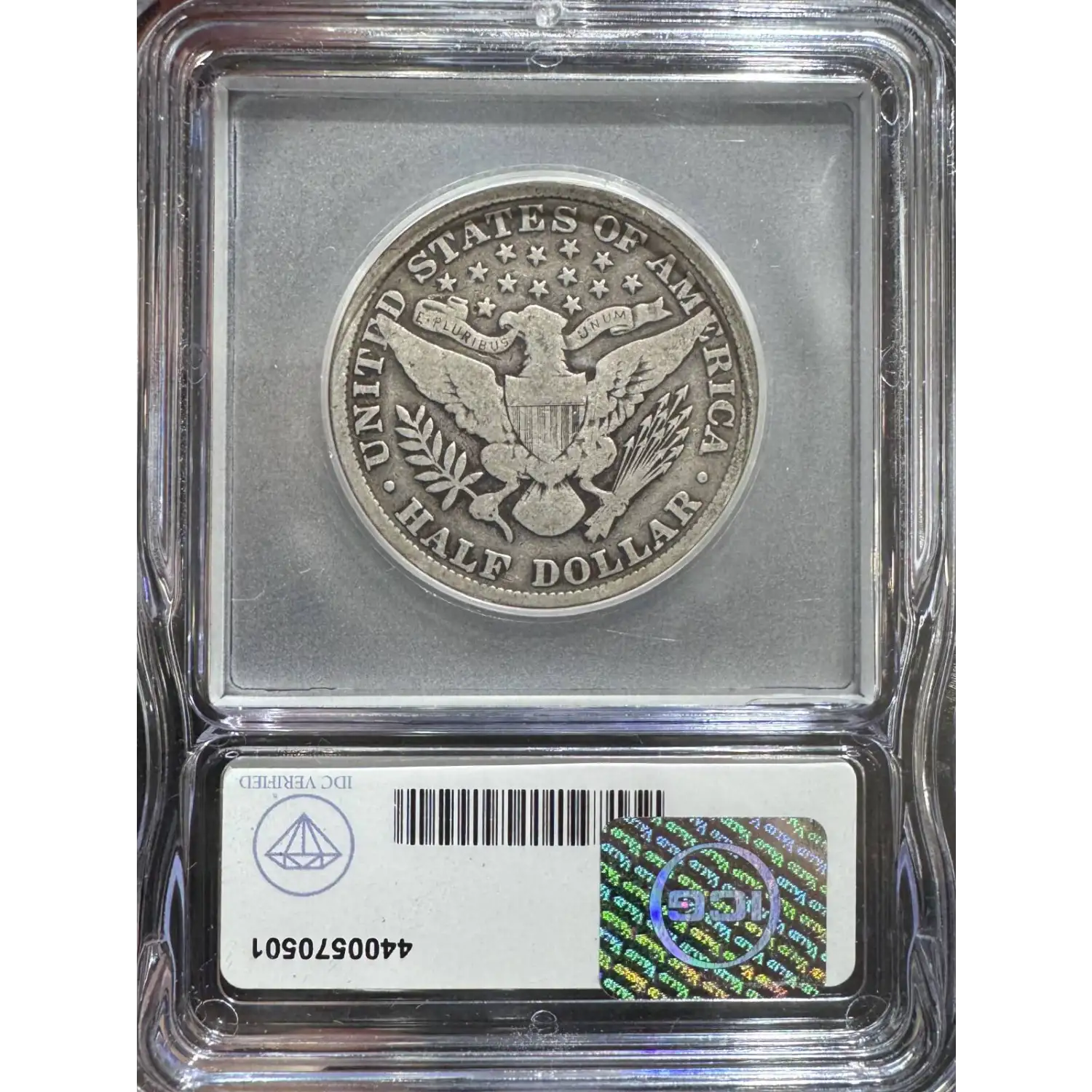 Reverse: The heraldic eagle holding the symbolic olive branches and arrows is centered in the design with the words UNITED STATES OF AMERICA and HALF DOLLAR around the periphery. A ribbon in the eagle's beak bears the motto E PLURIBUS UNUM. 13 stars appear in the field above the eagle's head. Mintmark, if any, is positioned under the eagles tail feathers, above the D in DOLLAR.