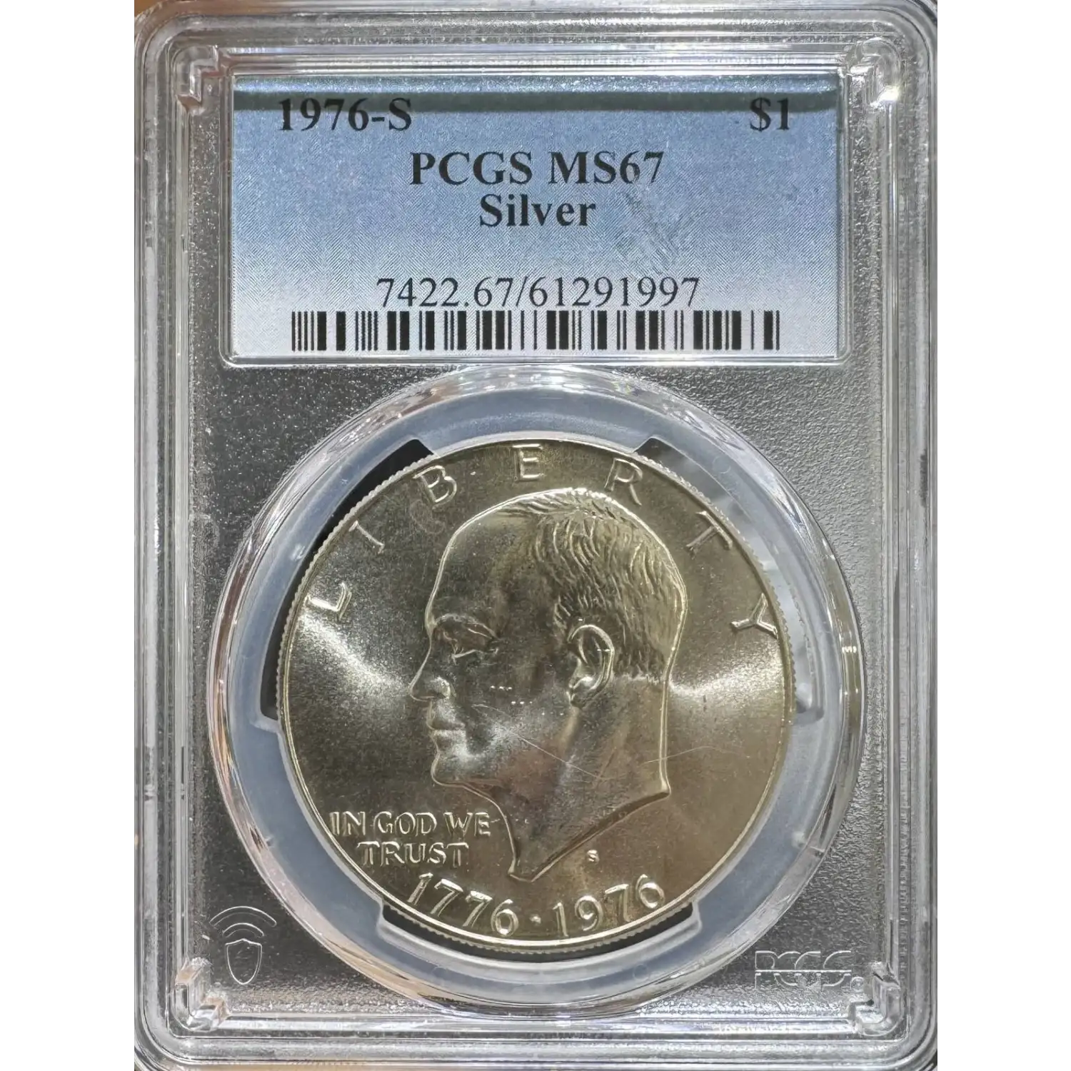 The 1976-S One Dollar is part of a series of Eisenhower dollar coins struck from 1976. The specific variety is Silver. Struck in San Francisco and designated as a Business (MS) strike, this coin is made of 40% silver; 60% copper from a mintage of 11,000,000 struck.