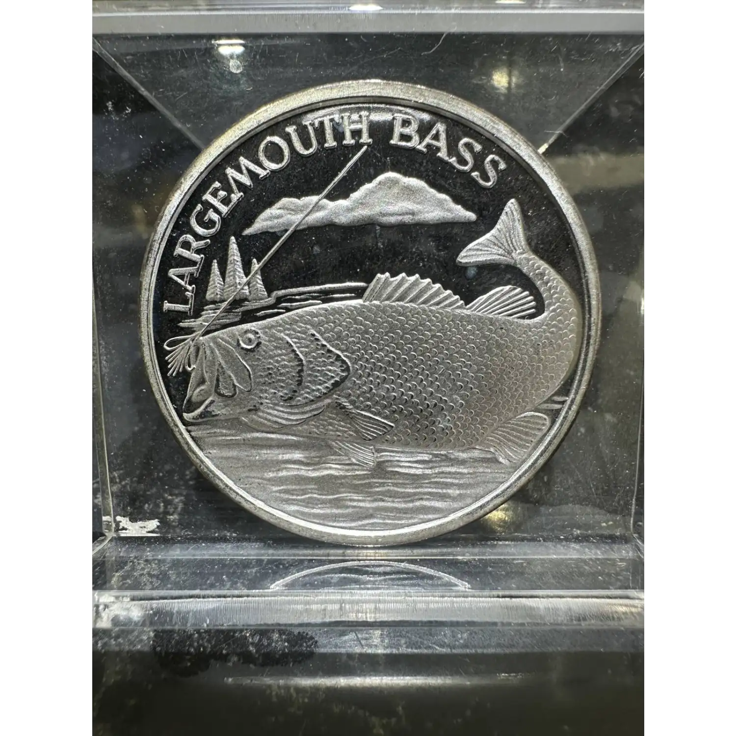 Obverse features a largemouth bass and the reverse features a chain design saying Made in United States of America One Troy Oz Silver 999.