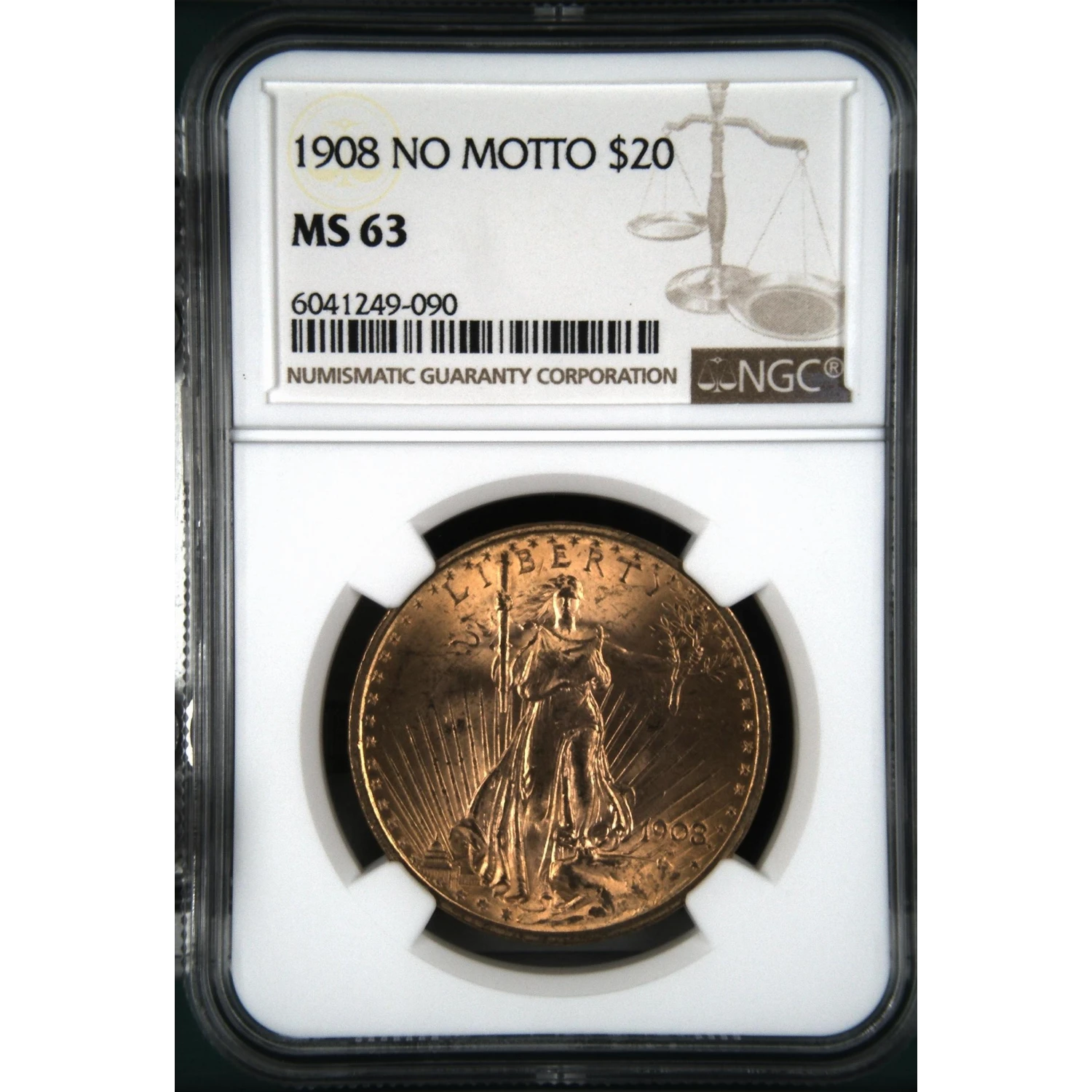 The 1908 No Motto is the last of the No motto Saint-Gaudens $20 which were retrofitted with the motto IN GOD WE TRUST later in 1908. The 1908 No Motto $20s are very common, certainly more so than even the 1907 No motto saints which are widely available. The 1908 No Motto double eagle is one of the most common of the entire series and thus are often sought by collectors who are building gold type collections. This piece is easily obtainable through the Gem Uncirculated grade range, with a handful known even in MS69.