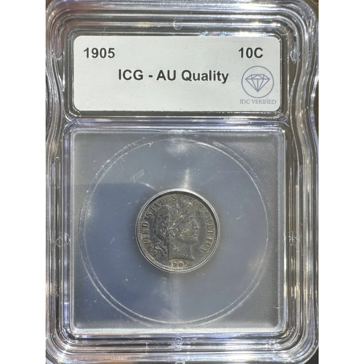 The 1905 10 Cents is part of a series of Liberty head (Barber) dime coins struck from 1892-1916. Struck in Philadelphia and designated as a Business (MS) strike, this coin is made of 90% silver; 10% copper from a mintage of 14,551,623 struck.