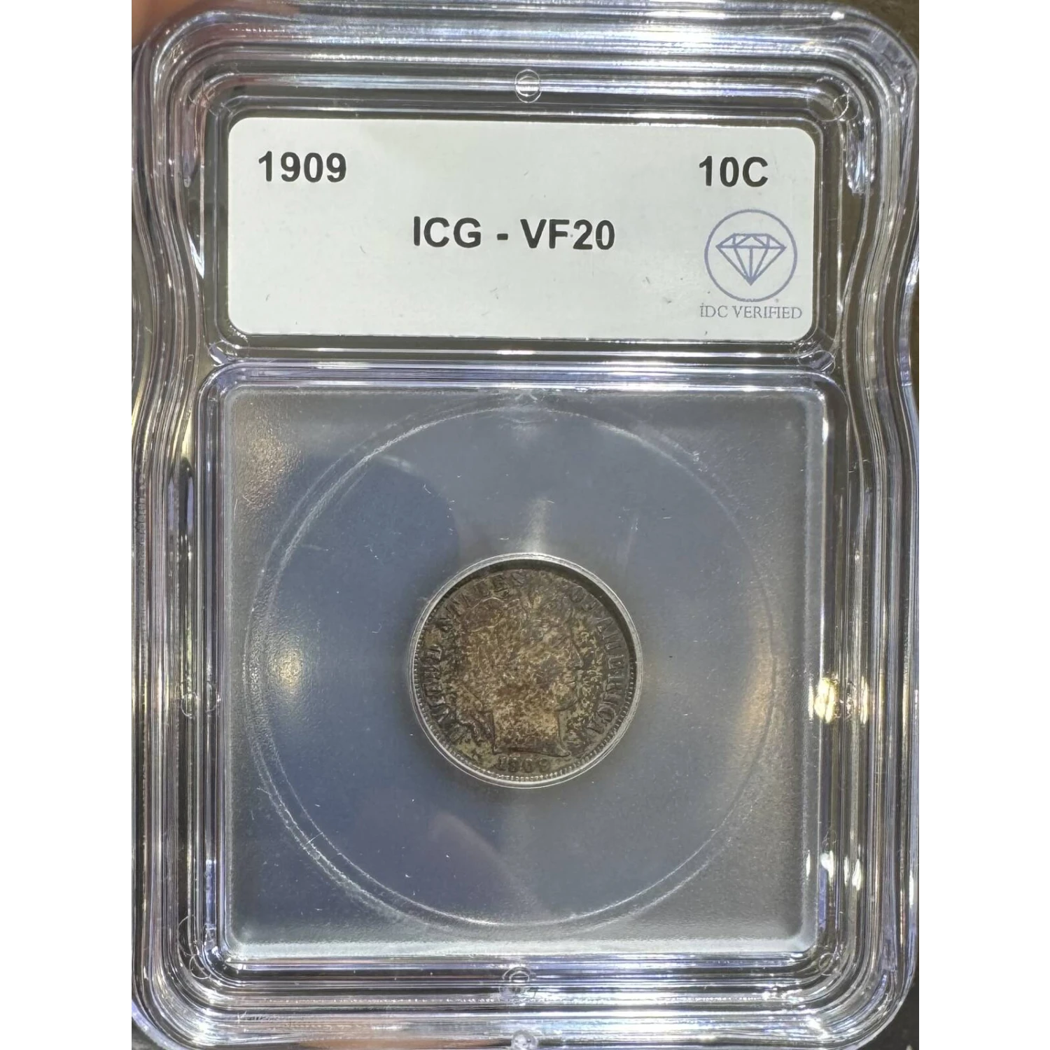 The 1909 10 Cents is part of a series of Liberty head (Barber) dime coins struck from 1892-1916. Struck in Philadelphia and designated as a Business (MS) strike, this coin is made of 90% silver; 10% copper from a mintage of 10,240,000 struck.