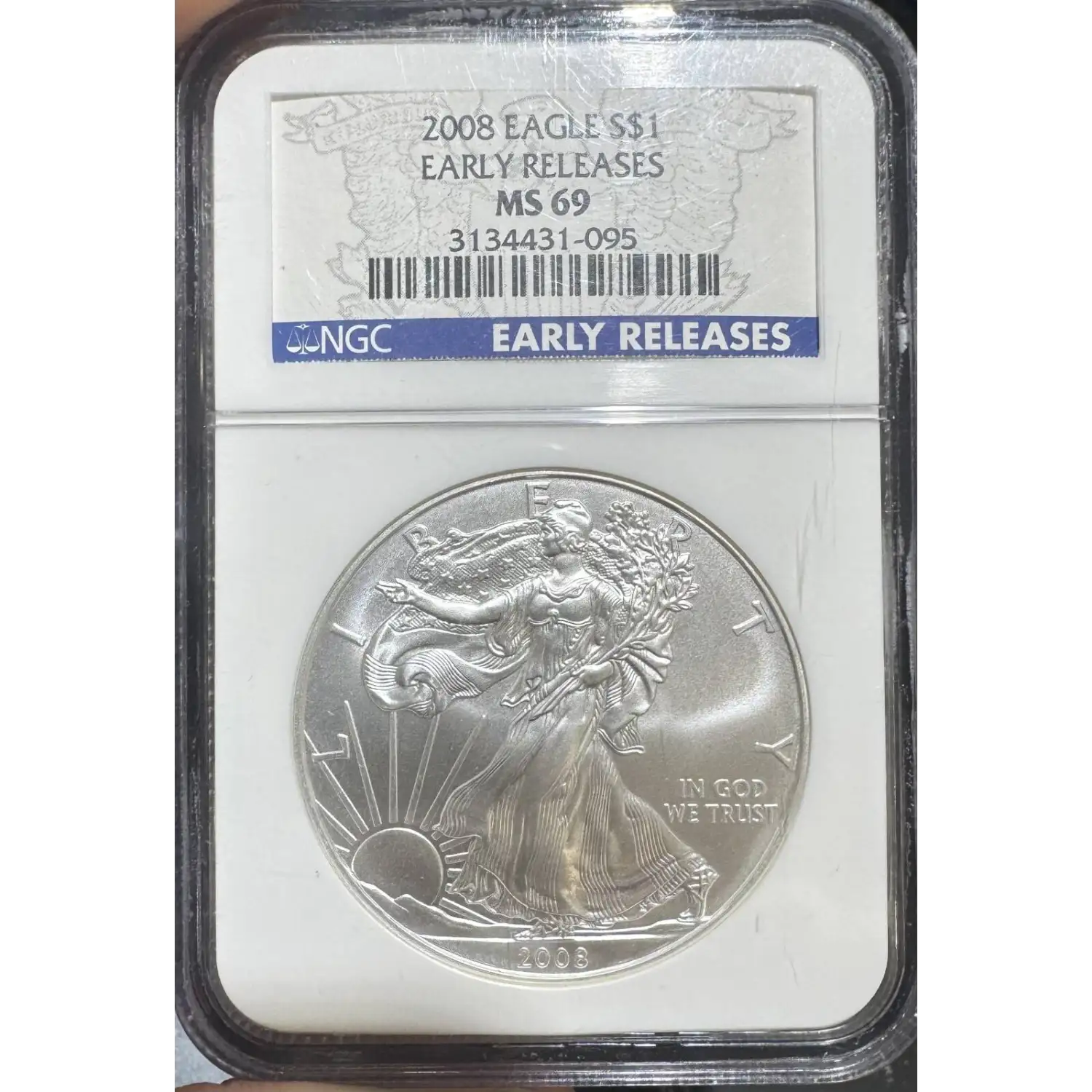 The 2008 One dollar is part of a series of Silver eagle coins struck from 1986-. The specific variety is Silver Eagle. Struck in Philadelphia and designated as a Business (MS) strike, this coin is made of 99.93% silver, 0.007% copper from a mintage of 20,583,000 struck.
