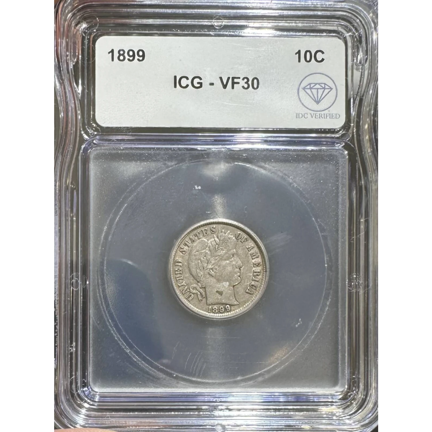 The 1899 10 Cents is part of a series of Liberty head (Barber) dime coins struck from 1892-1916. Struck in Philadelphia and designated as a Business (MS) strike, this coin is made of 90% silver; 10% copper from a mintage of 19,580,000 struck.