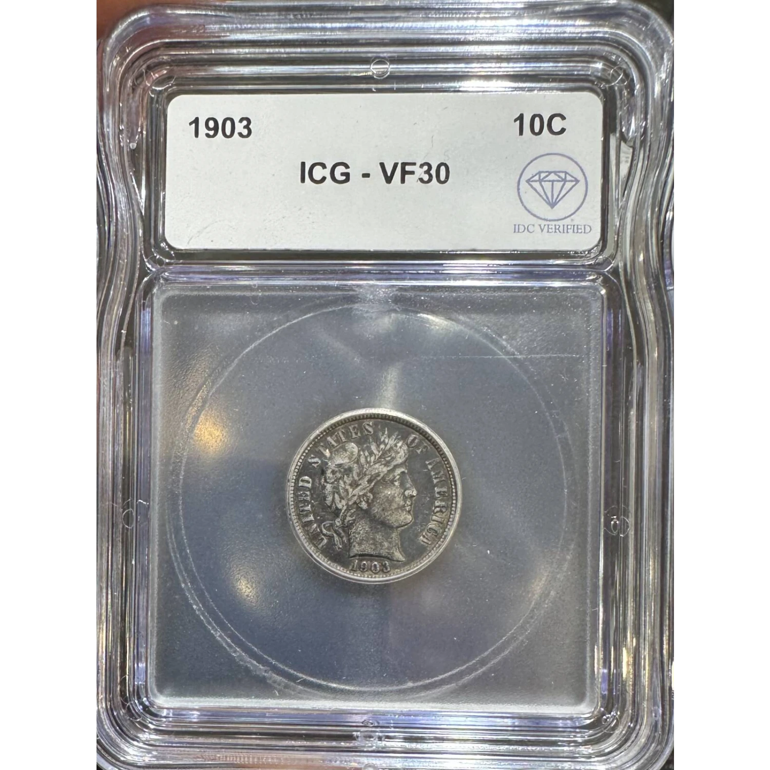 The 1903 10 Cents is part of a series of Liberty head (Barber) dime coins struck from 1892-1916. Struck in Philadelphia and designated as a Business (MS) strike, this coin is made of 90% silver; 10% copper from a mintage of 19,500,000 struck.