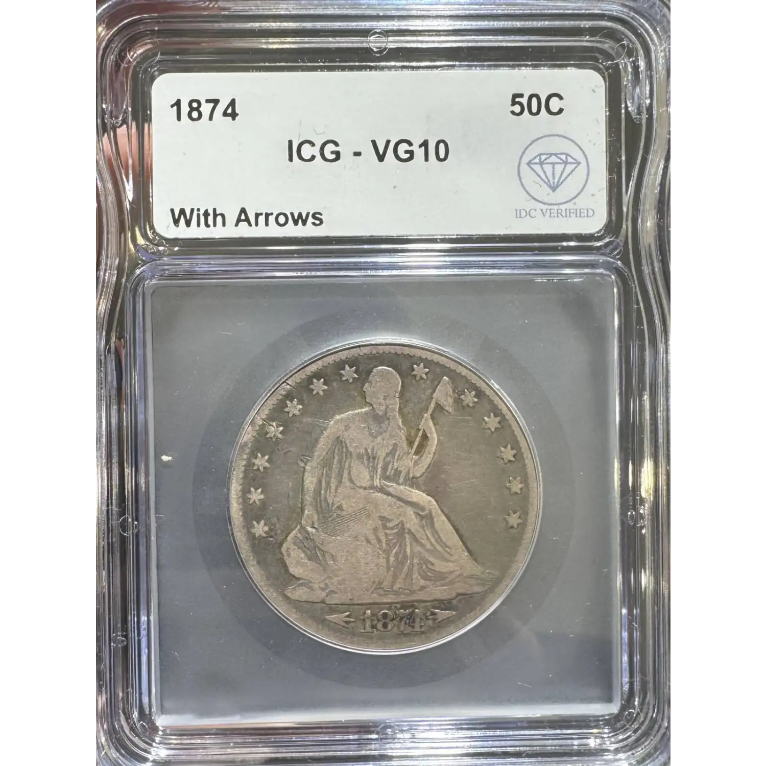 The 1874 50 Cents is part of a series of Liberty Seated half dollar coins struck from 1873-1874. The specific variety is Arrows. Struck in Philadelphia and designated as a Business (MS) strike, this coin is made of 90% silver; 10% copper from a mintage of 2,359,600 struck.