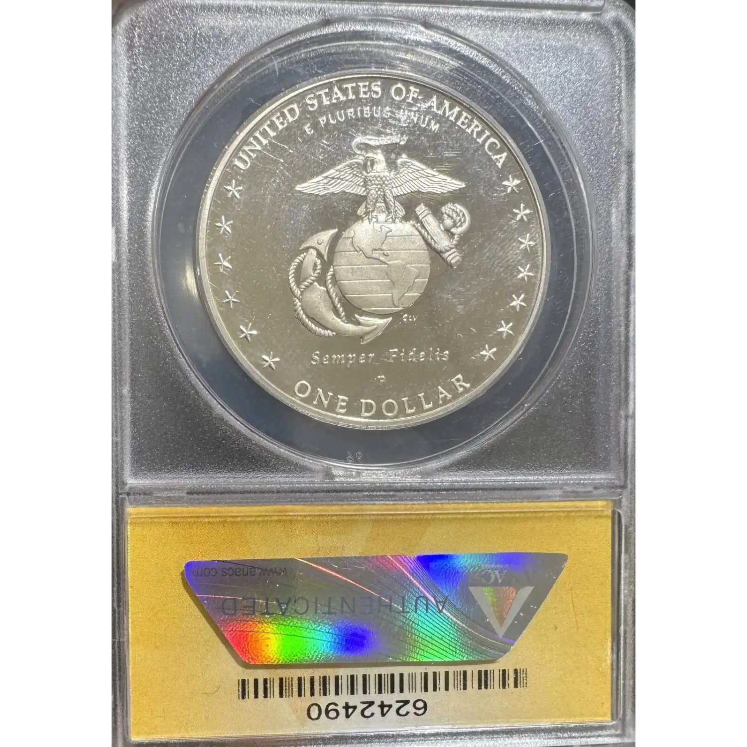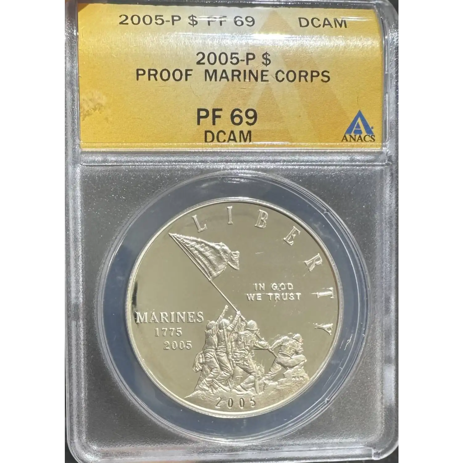 The 2005-P Silver dollar is part of a series of Modern Commemorative coins struck from 2005. The specific variety is Marine Corps 230th Anniversary. Struck in Philadelphia and designated as a Proof (PR) strike, this coin is made of 90% silver, 10% copper from a mintage of 548,810 struck.