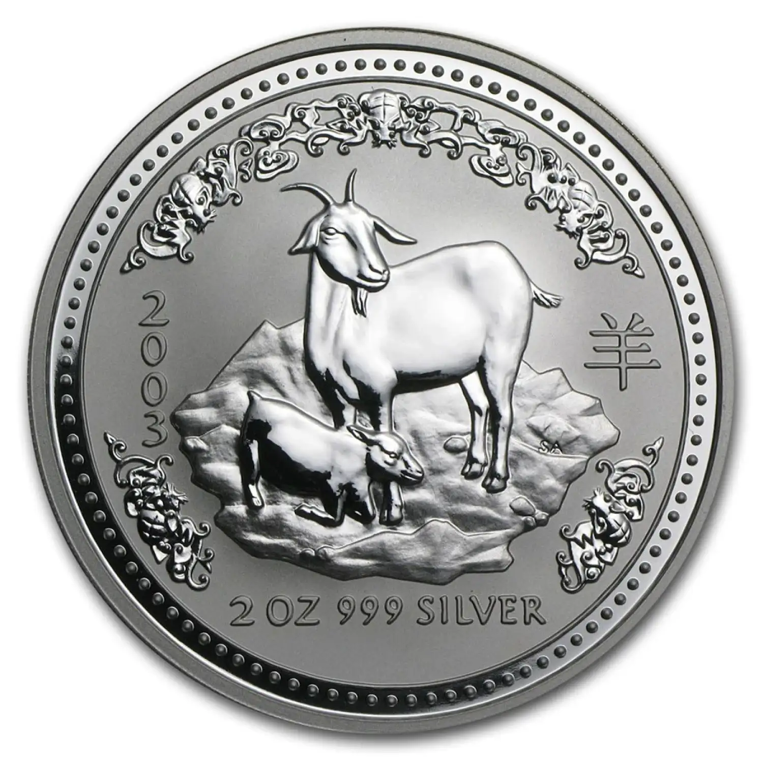 The 2003 Silver Lunar Year of the Goat features a nanny goat and kid with rocks beneath them, design by Sarah Anderson.