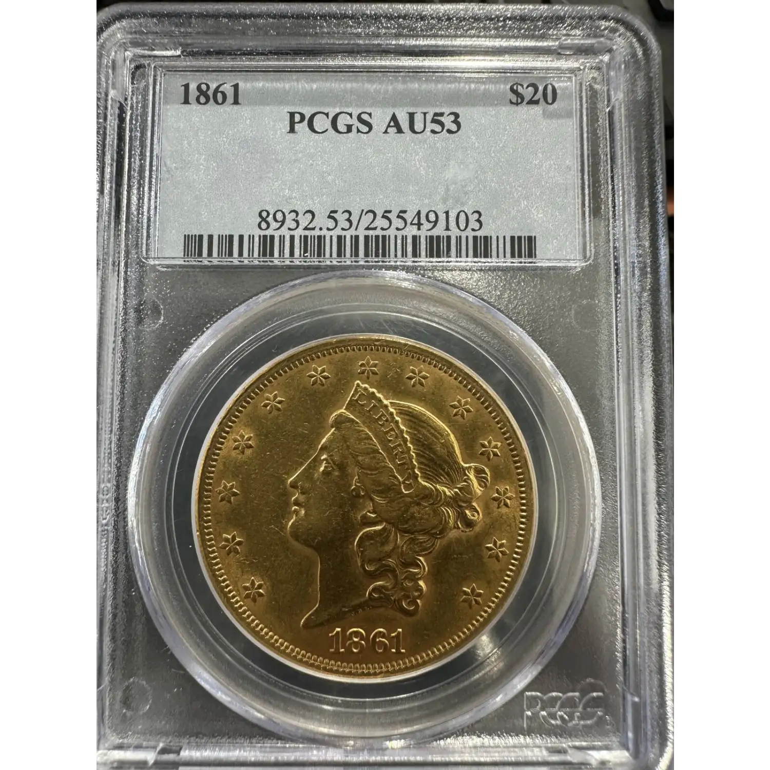 1861 $20 Liberty Head PCGS AU-53 Type 1