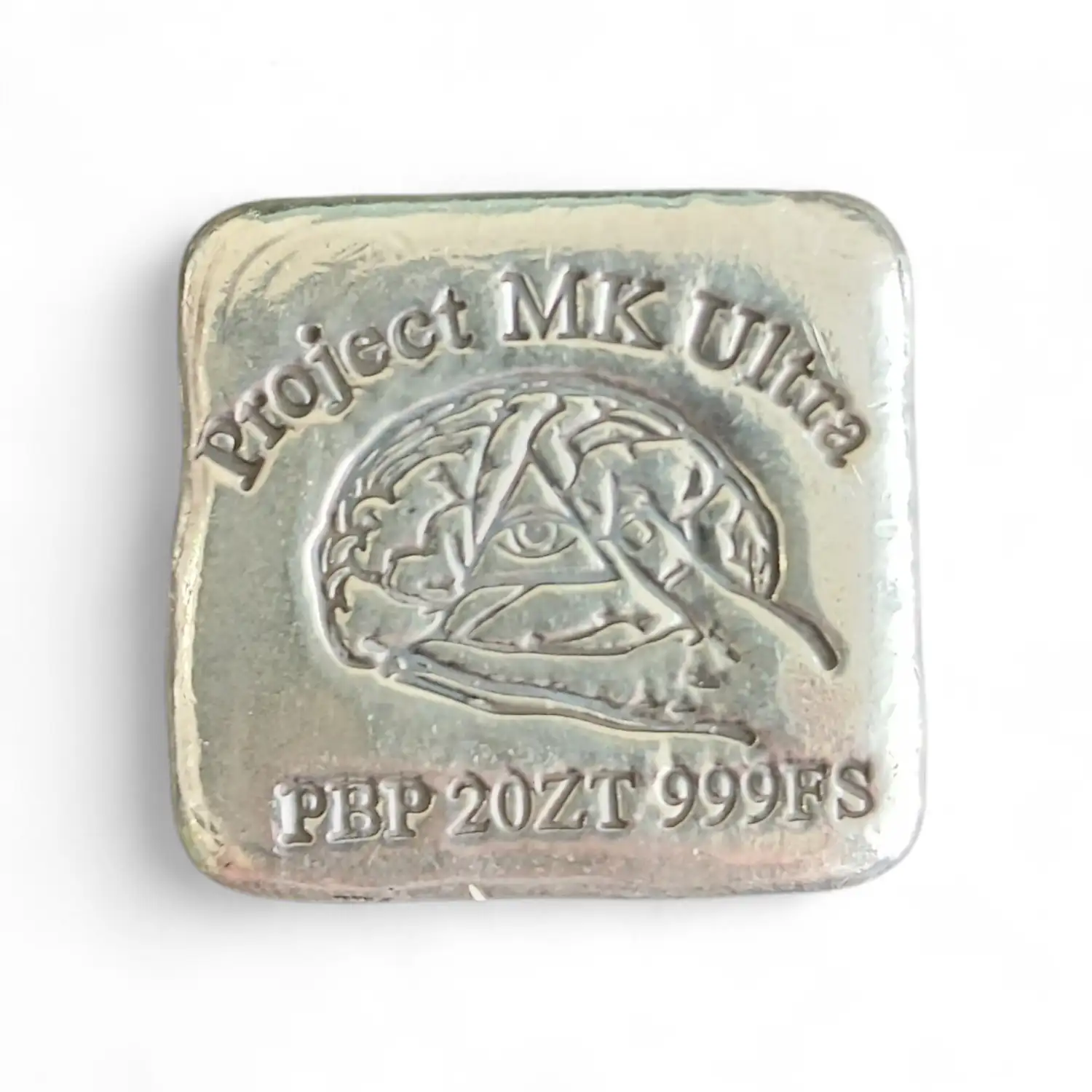 The Polar Bear Pours MK ULTRA 2 oz Silver Pour is a 2 oz silver bar with a fineness of 0.999. Produced by Polar Bear Pours, out of Oklahoma, USA