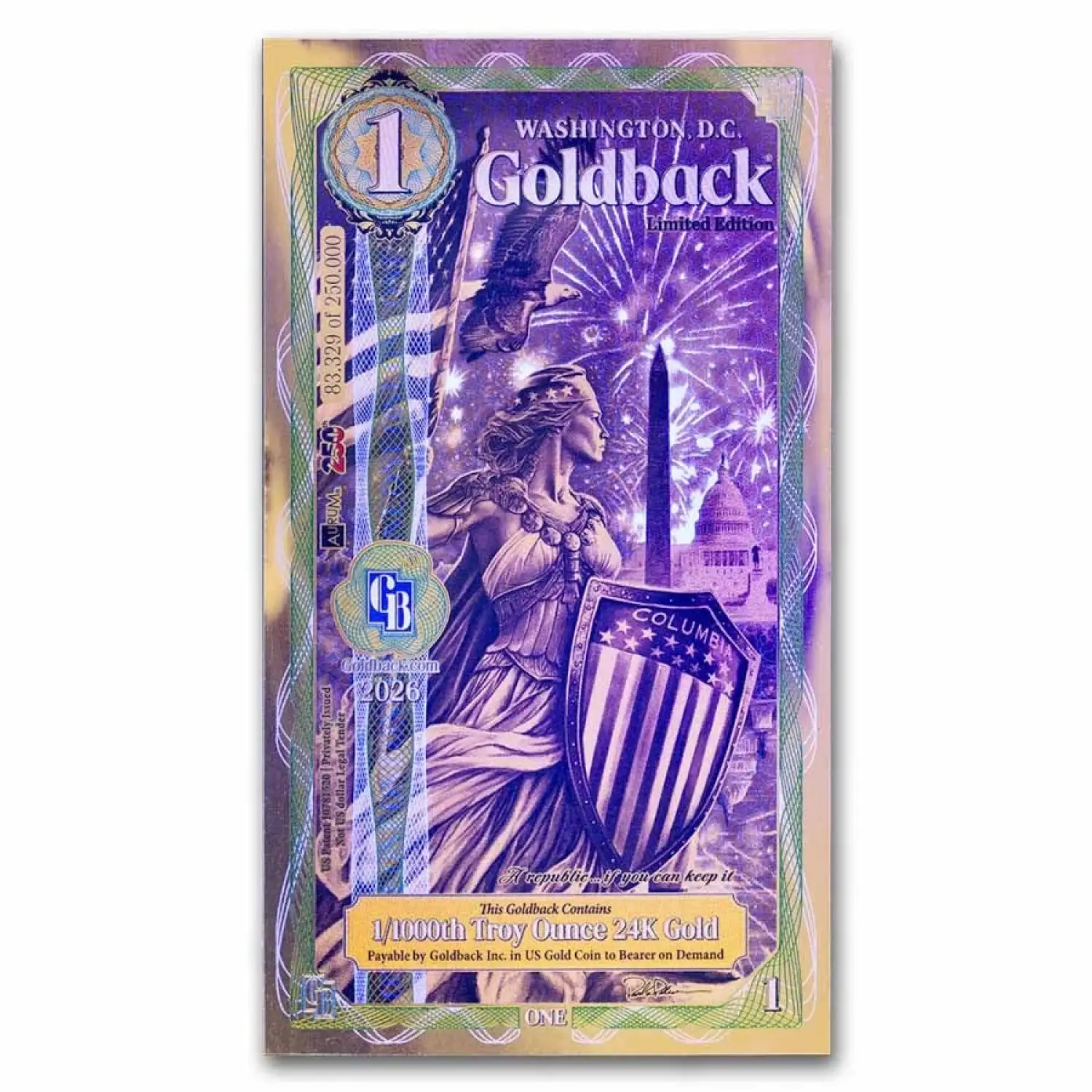 Product DetailsThe Washington D.C. Goldback is a single-issue note honoring the 250th anniversary of the United States. Each note contains 1/1000th oz .9999 fine 24K Gold and features an all-new design with upgraded security and anti-counterfeiting technology.