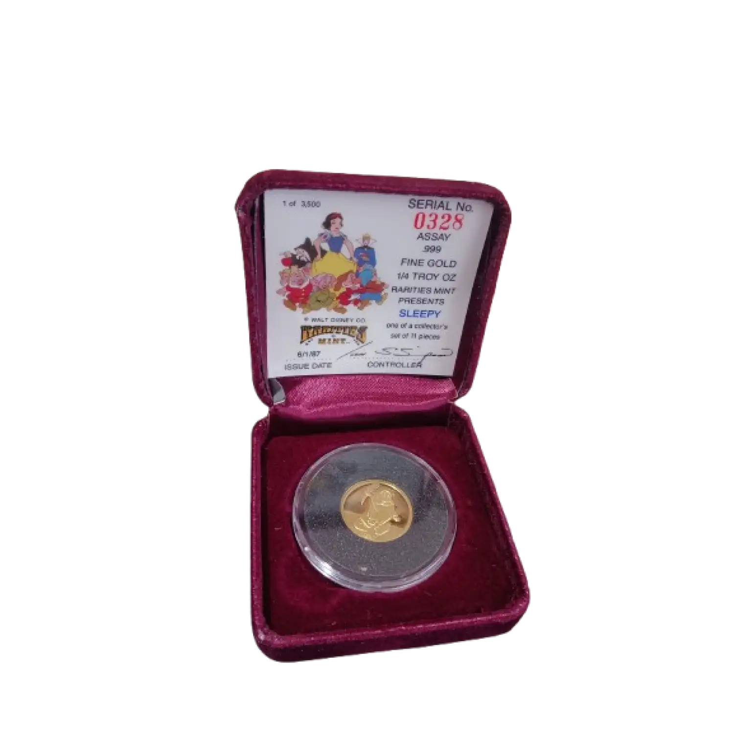 This round was originally sold as part of a collector’s set in 1987 that featured 11 pieces. This round features "Sleepy" one of the seven dwarfs and commemorates the 50th anniversary of Snow White, which was first released in 1937 by Walt Disney.
