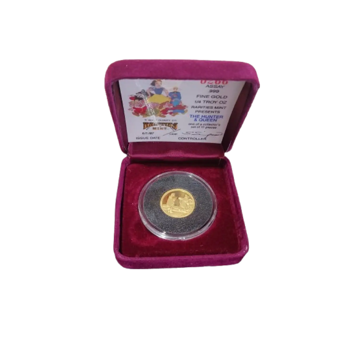 This round was originally sold as part of a collector’s set in 1987 that featured 11 pieces. This round features "The Hunter & Queen" and commemorates the 50th anniversary of Snow White, which was first released in 1937 by Walt Disney.