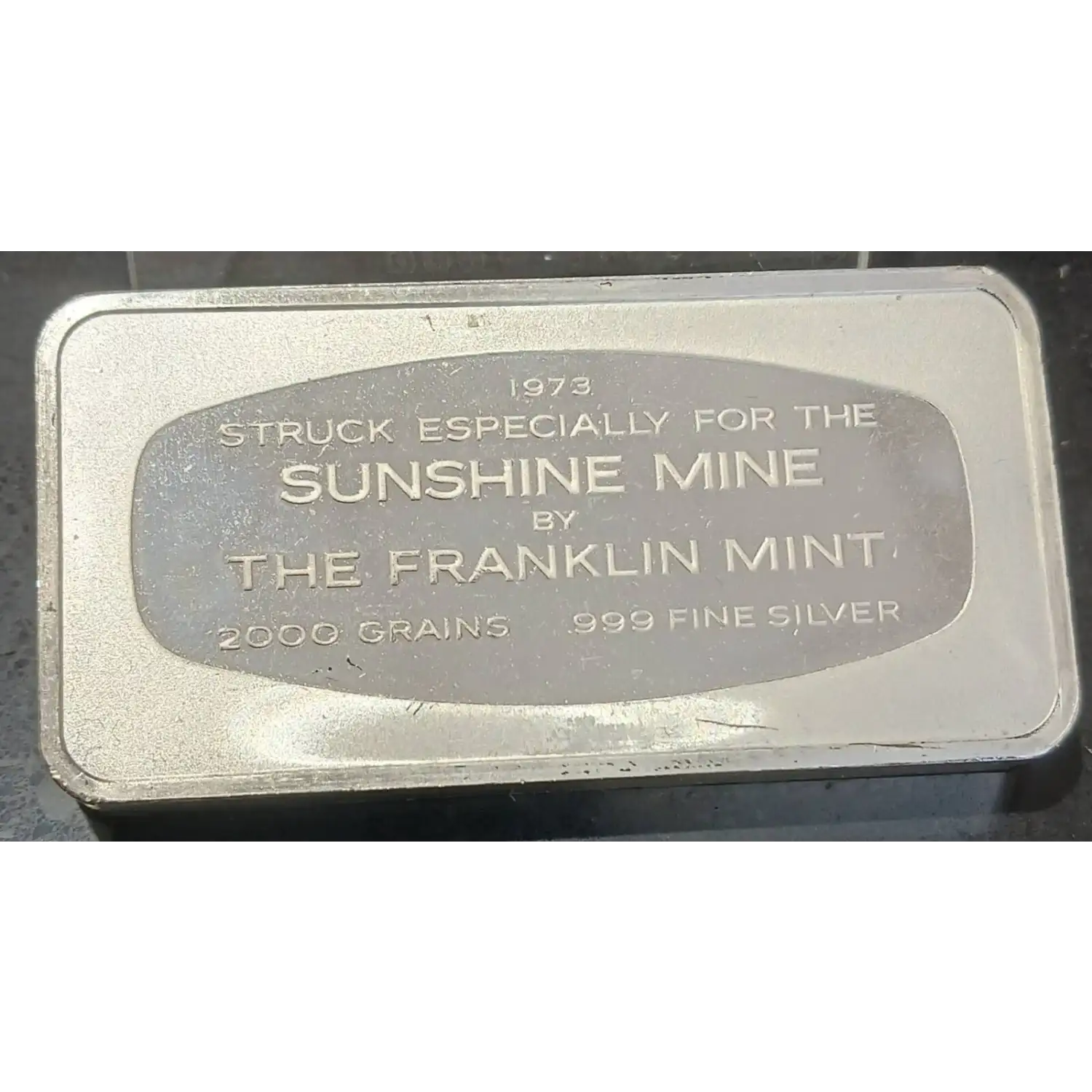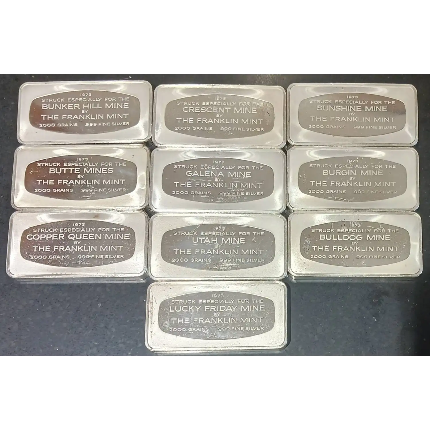 Here is the 1973 scarce edition of Franklin Mint's " The Great Silver-Producing Mines Of The American West. Each of the ten circulated condition bars weigh 4.167+ troy ounces of .999 silver each. These bars represent Butte Mines,Galena Mines,Bunker Hill Mine, Crecent Mine, Lucky Friday Mine, Bull dog Mine, Utah Mine, Burgin Mine, Copper Queen Mine and the Sunshine Mine. Five of the mines are Idaho bars.