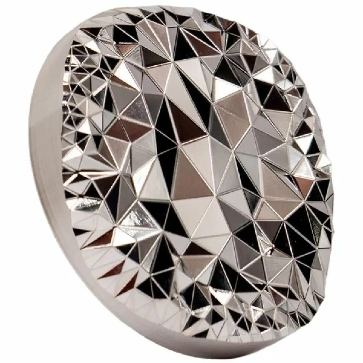 The reverse side of this coin is like a love letter to silver. Using CIT’s smartminting® technology, this design has many facets cut almost like a diamond on the surface. Each facet is cut in a triangle that is matched up with other symbols and is reminiscent of the EPCOT ball at Disney World. These triangles all form a series of hills on the surface of the coin. These facets coupled with the fact that it literally pops out of the coin make the light dance and reflect in a manner never seen before in a coin. When you see it in person you can’t help thinking of a diamond in the way the light reflects.