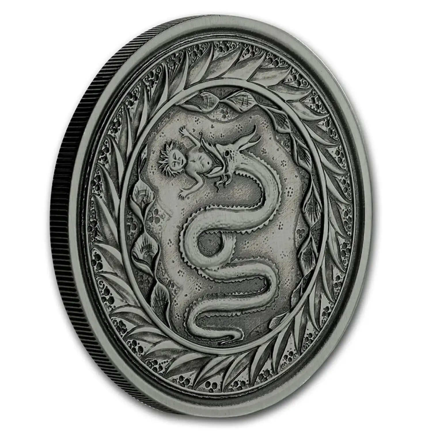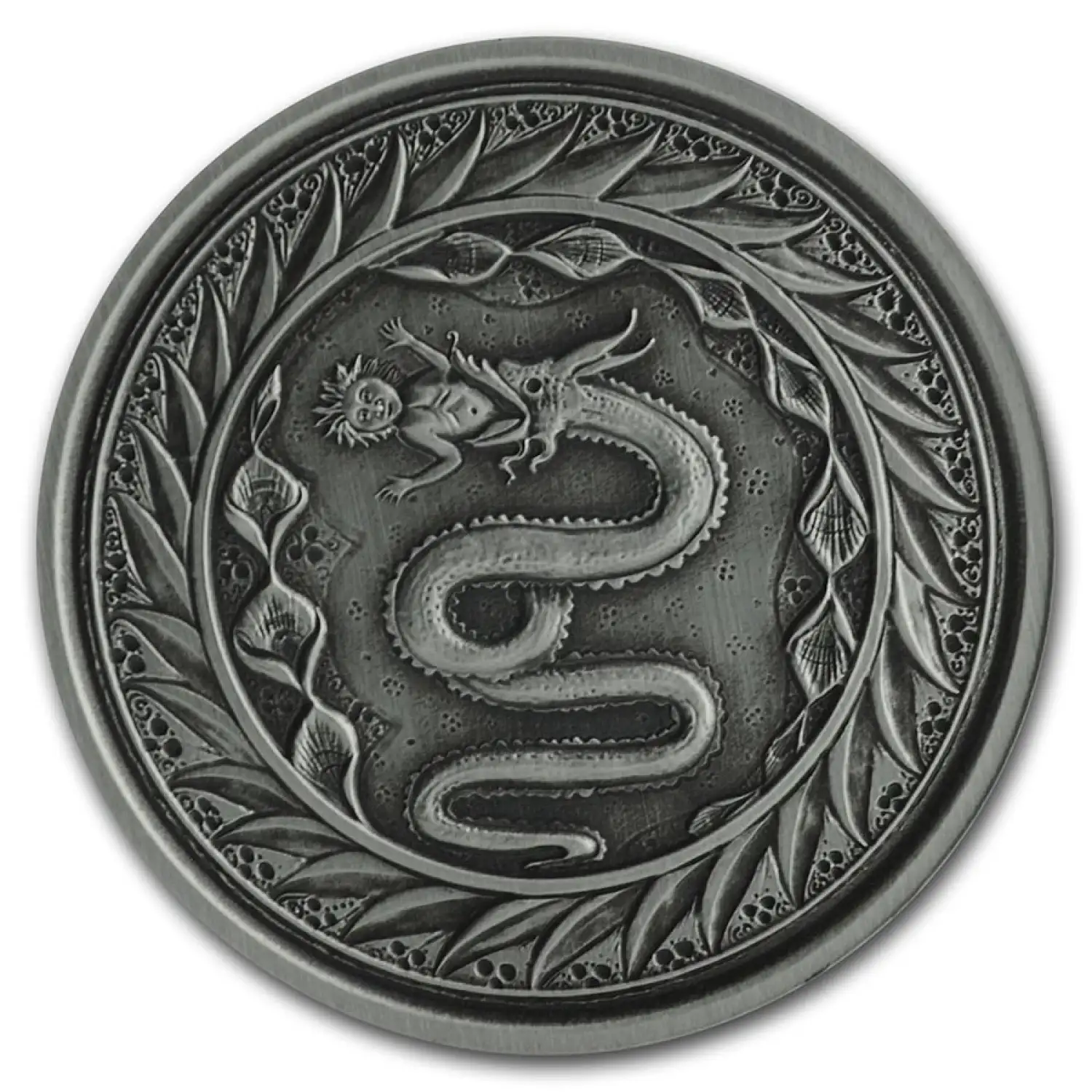 Issued from the island nation of Samoa comes this low mintage bullion coin featuring the emblem of the Visconti of Milan, a child being swallowed by a serpent. The unique artistic appeal makes this 1 oz Silver coin a rare treasure.
