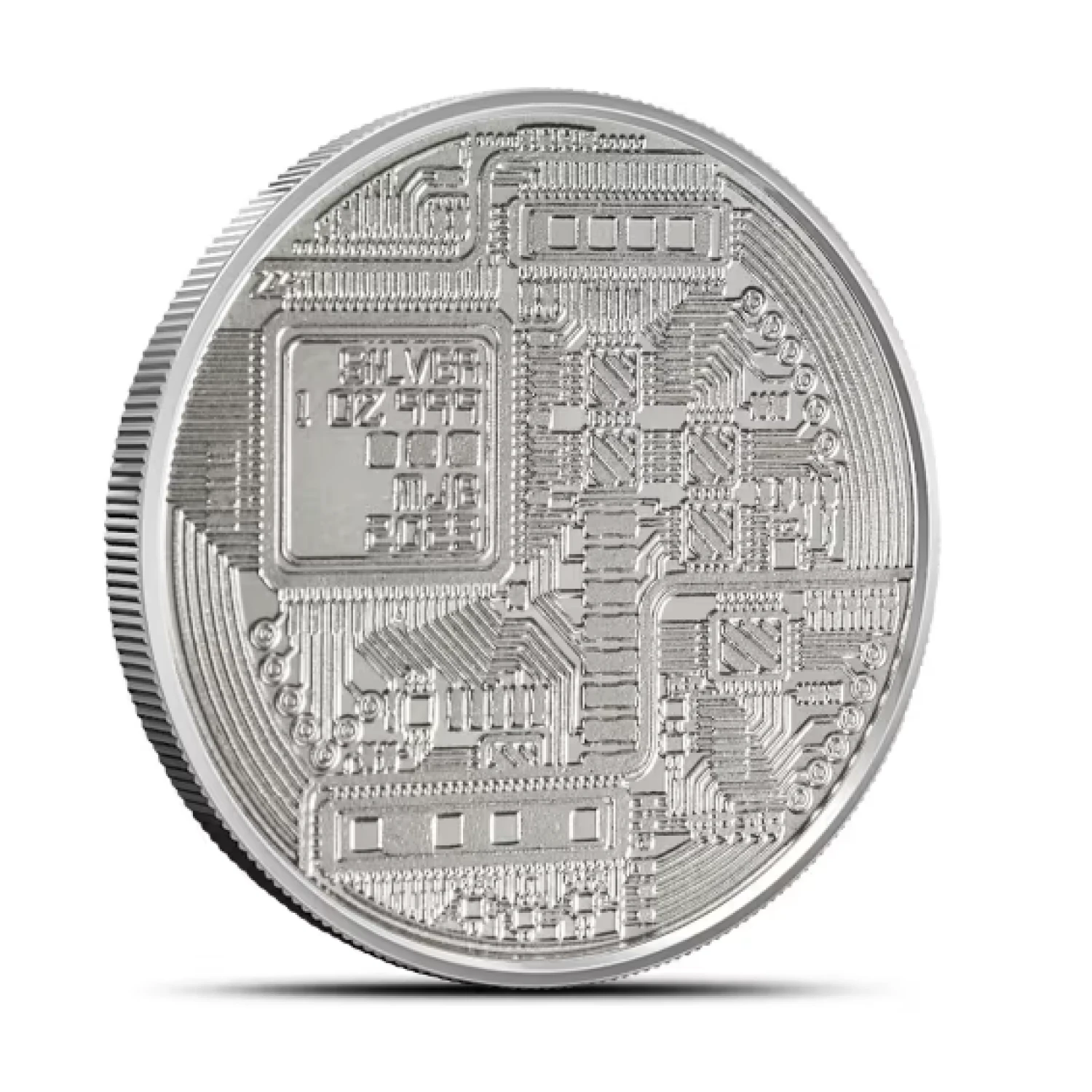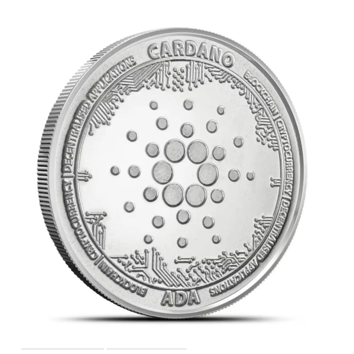 Reverse visuals on the Crypto Commemorative Cardano Silver Round focus on the common design of the series. The design element featured here has been used on all of the rounds in the Crypto Commemorative Series and showcases a digital design theme that was first used in 2011 on the first crypto-themed silver rounds.