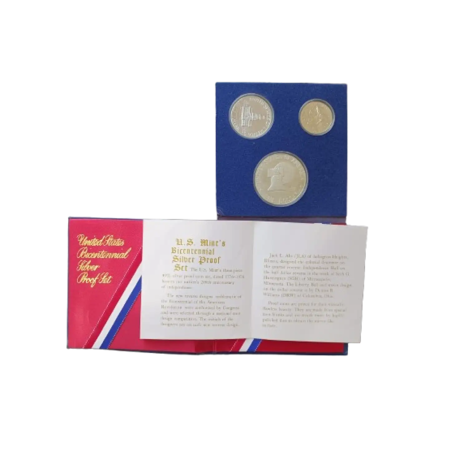 This three-coin set contains proof examples of the Bicentennial design quarter, half dollar and dollar, struck in 40% Silver.