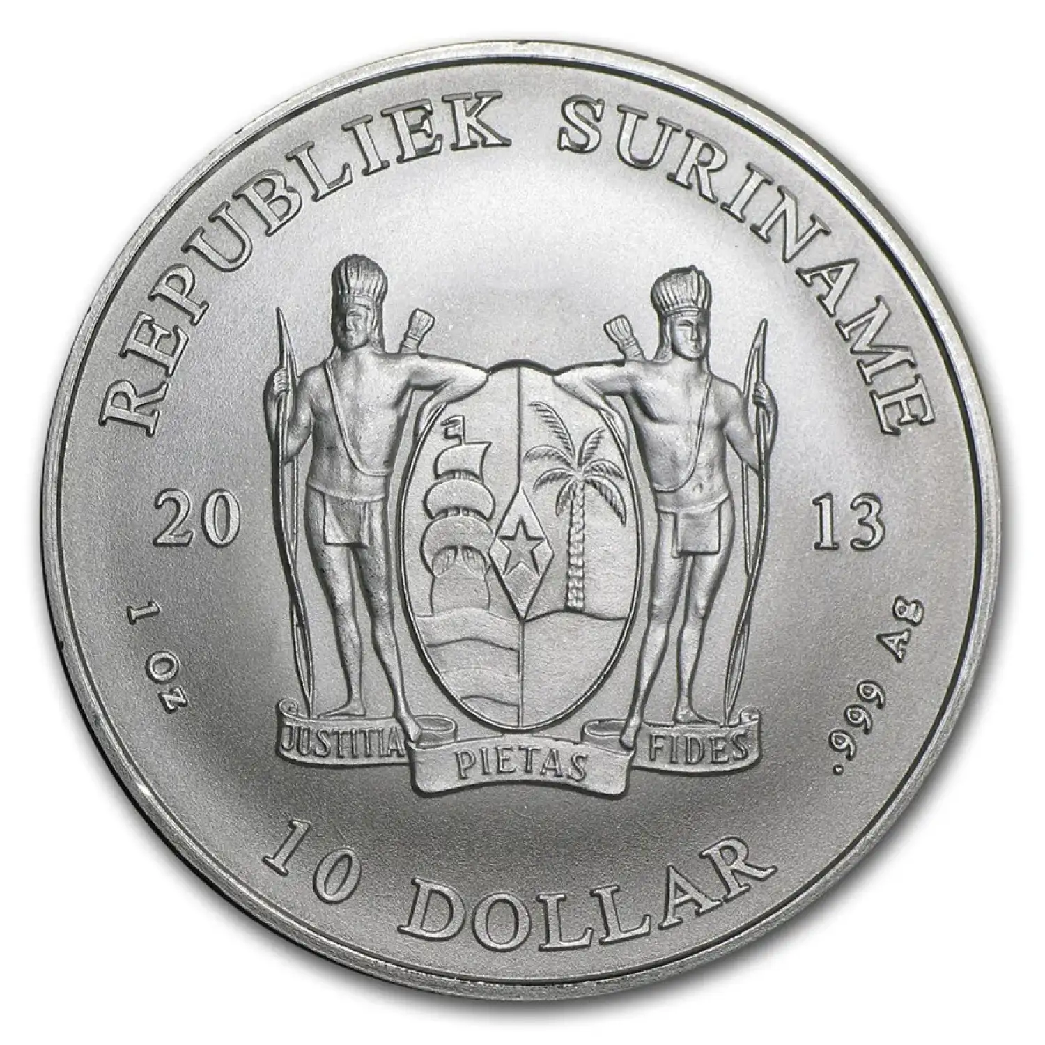 Suriname’s Coat of Arms is featured on the reverse along with “REPUBLIEK SURINAME,” “10 DOLLAR” and the coin’s weight, fineness and year. Each coin is guaranteed and minted by the European Central Mint in Amsterdam with a face value of $10 Surinamese dollars.